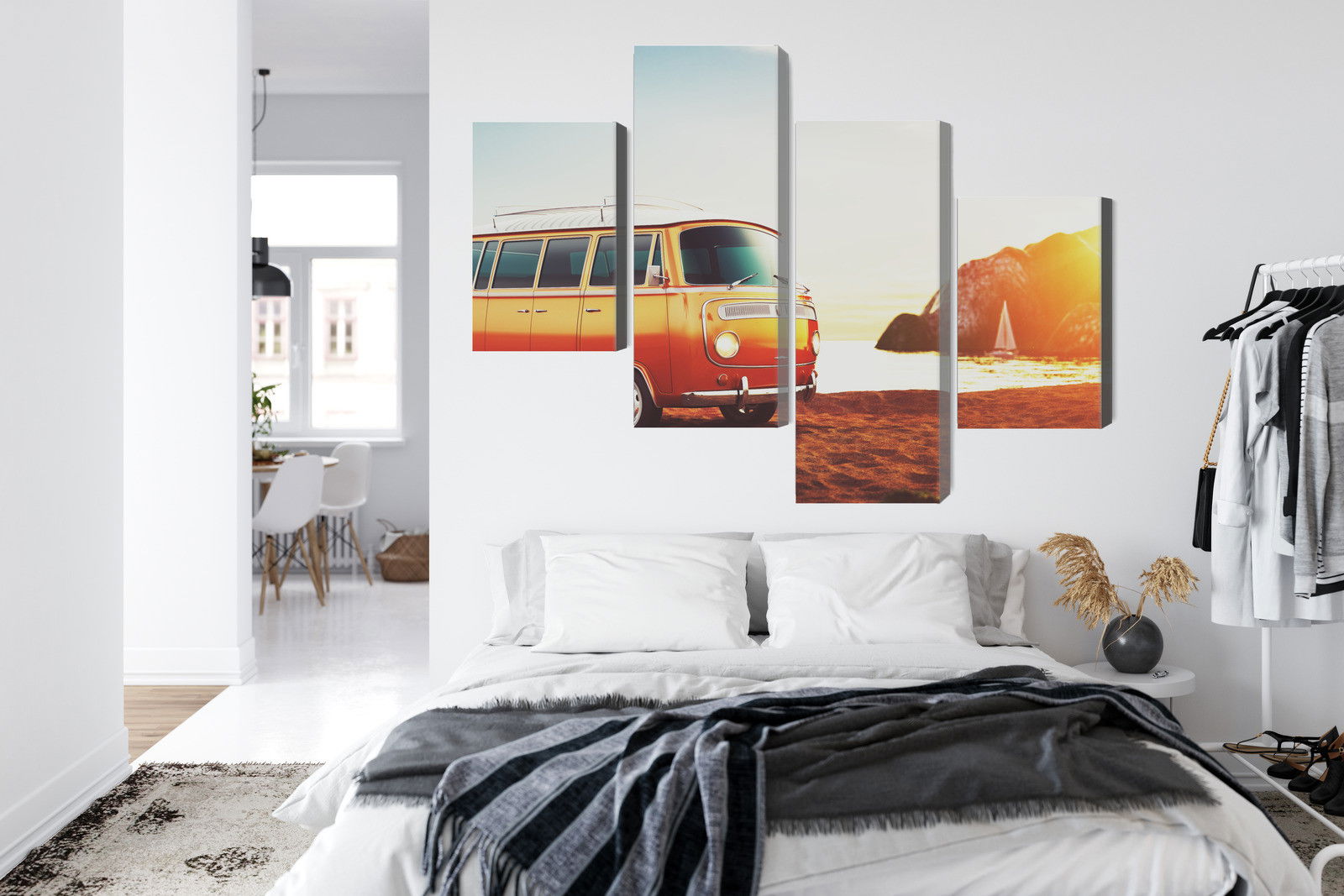 SilentDirects ljuddämpande tavla Retro car on the beach kombinerar ett högupplöst motiv med avancerad akustikteknik. Varje tavla monteras i Sverige och bygger på en stabil canvastavla med fururam, där insidan av ramen fylls med en ljudabsorberande kärna av återvunnen polyester. Konstruktionen gör tavlan till ett både estetiskt och funktionellt inslag i rummet.