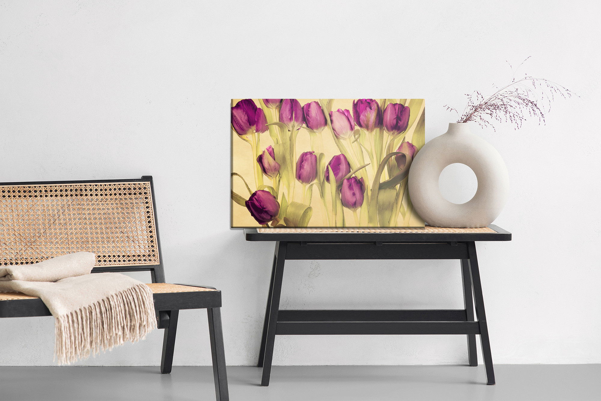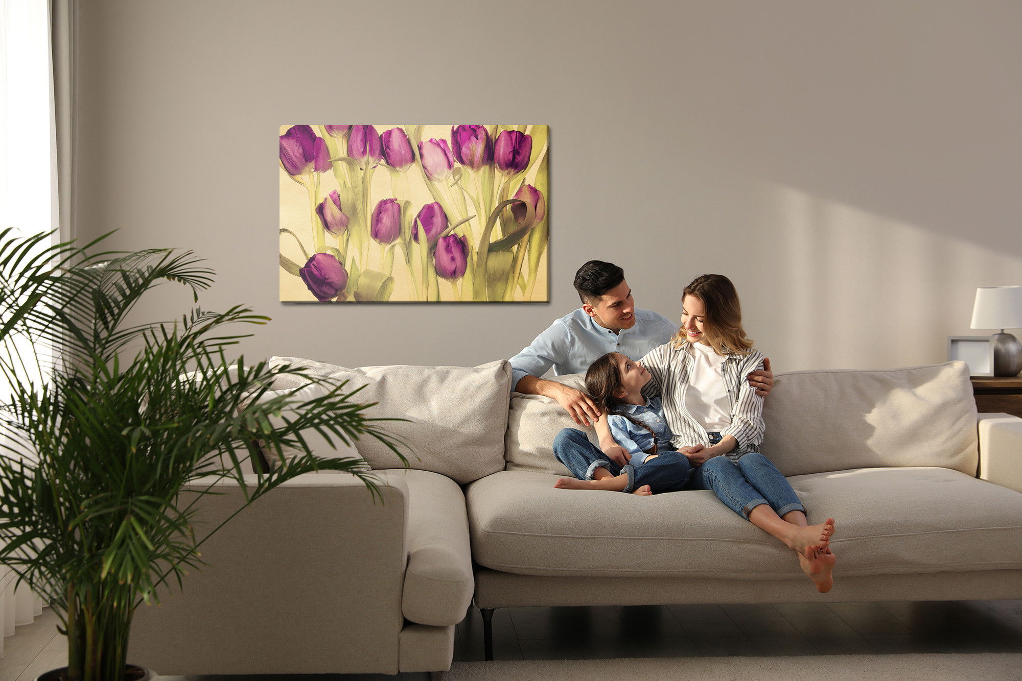 Varje tavla monteras på en massiv fururam. Format upp till 70×50 cm har en ram på 15 mm, medan format från 90×60 cm och uppåt har en ram på 20 mm. Den exakta dukspänningen gör att tavlan håller sin form över tid. Motivet Retro style tulips trycks runt hela ramen vilket ger ett stilrent galleriuttryck där tavlan är lika vacker från sidan som framifrån. Kombinationen av rak dukspänning, rena linjer och korrekt tryck ger en professionell finish.