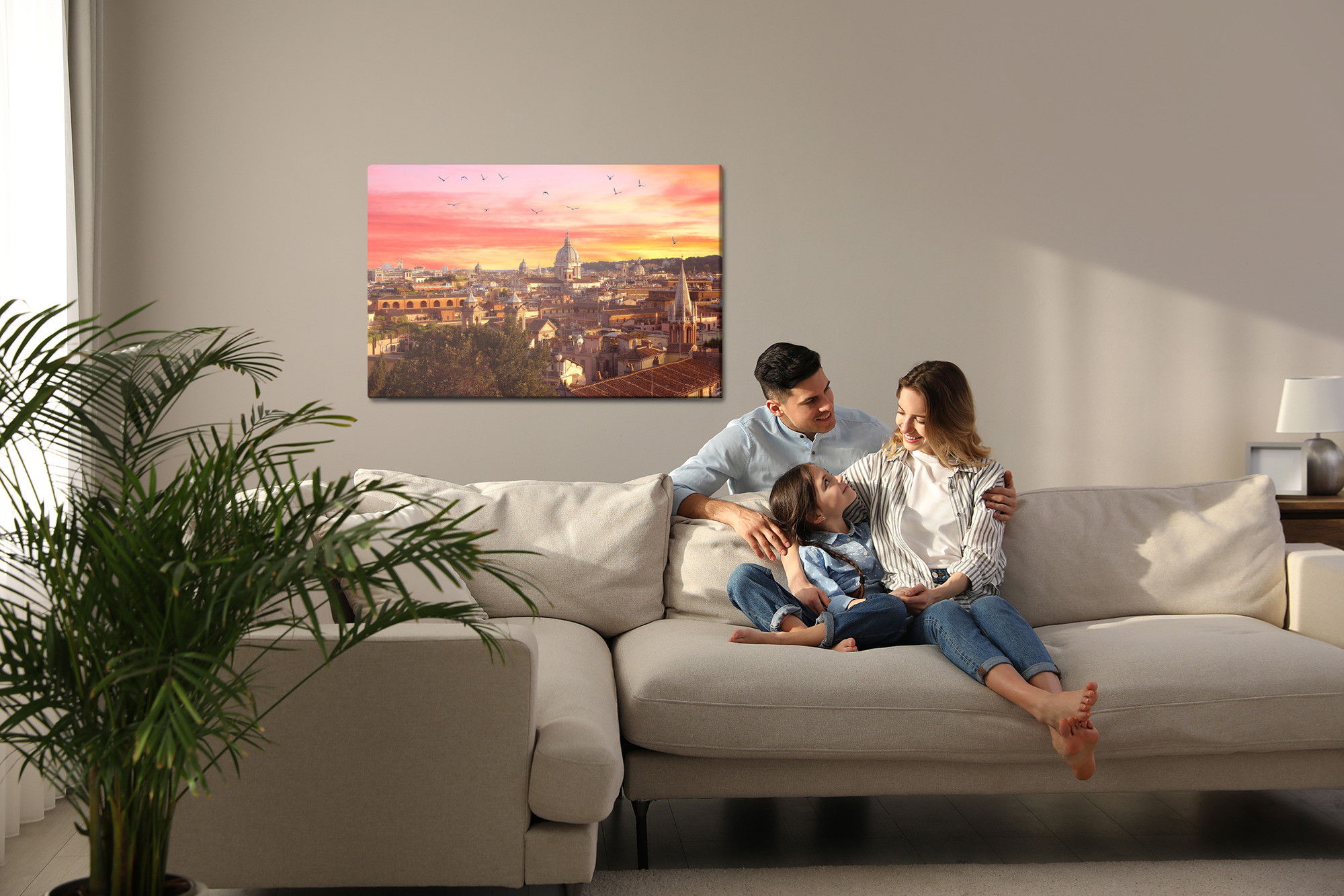 Varje tavla monteras på en massiv fururam. Format upp till 70×50 cm har en ram på 15 mm, medan format från 90×60 cm och uppåt har en ram på 20 mm. Den exakta dukspänningen gör att tavlan håller sin form över tid. Motivet Roman 3d panorama trycks runt hela ramen vilket ger ett stilrent galleriuttryck där tavlan är lika vacker från sidan som framifrån. Kombinationen av rak dukspänning, rena linjer och korrekt tryck ger en professionell finish.