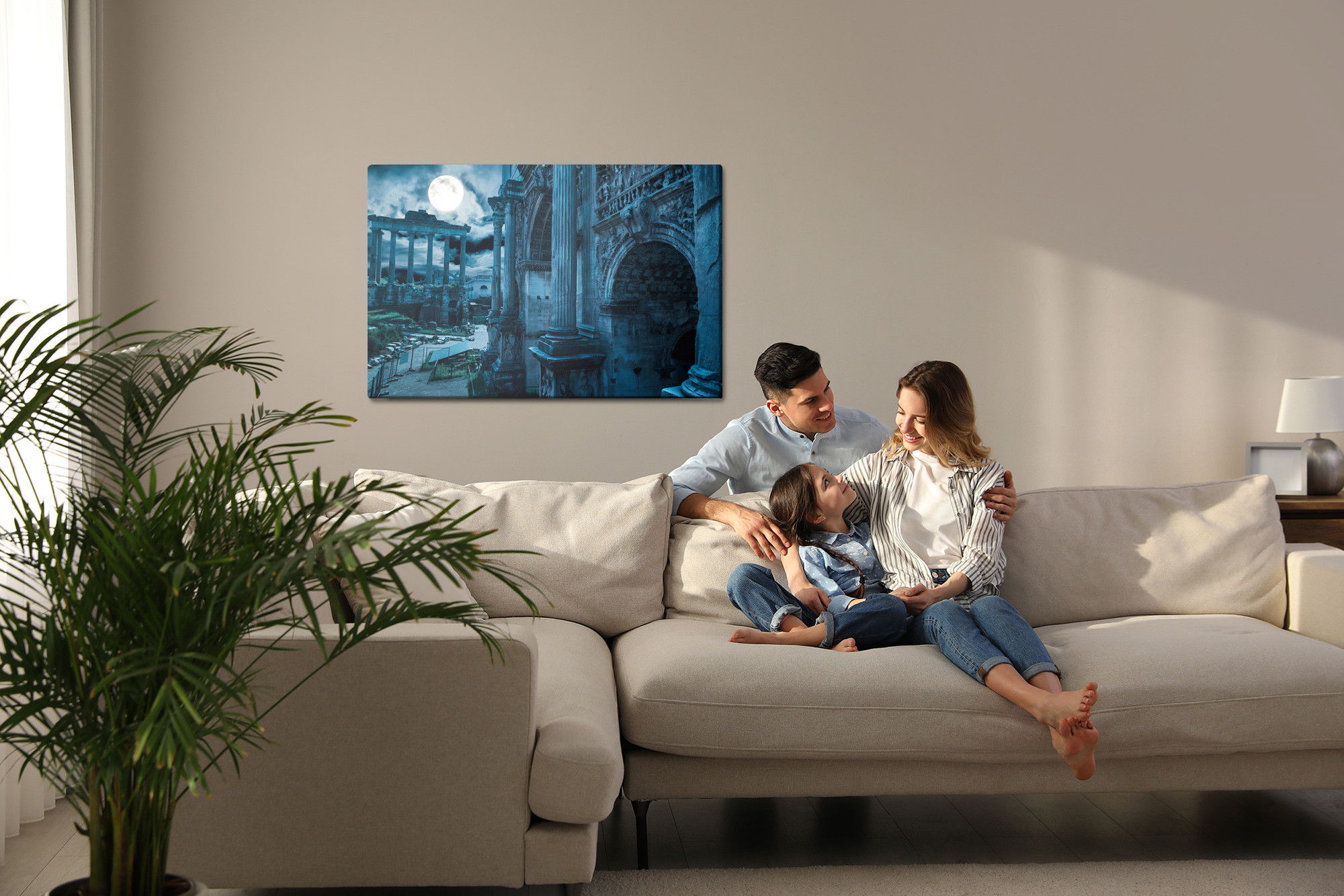 Varje tavla monteras på en massiv fururam. Format upp till 70×50 cm har en ram på 15 mm, medan format från 90×60 cm och uppåt har en ram på 20 mm. Den exakta dukspänningen gör att tavlan håller sin form över tid. Motivet Roman forum by night trycks runt hela ramen vilket ger ett stilrent galleriuttryck där tavlan är lika vacker från sidan som framifrån. Kombinationen av rak dukspänning, rena linjer och korrekt tryck ger en professionell finish.