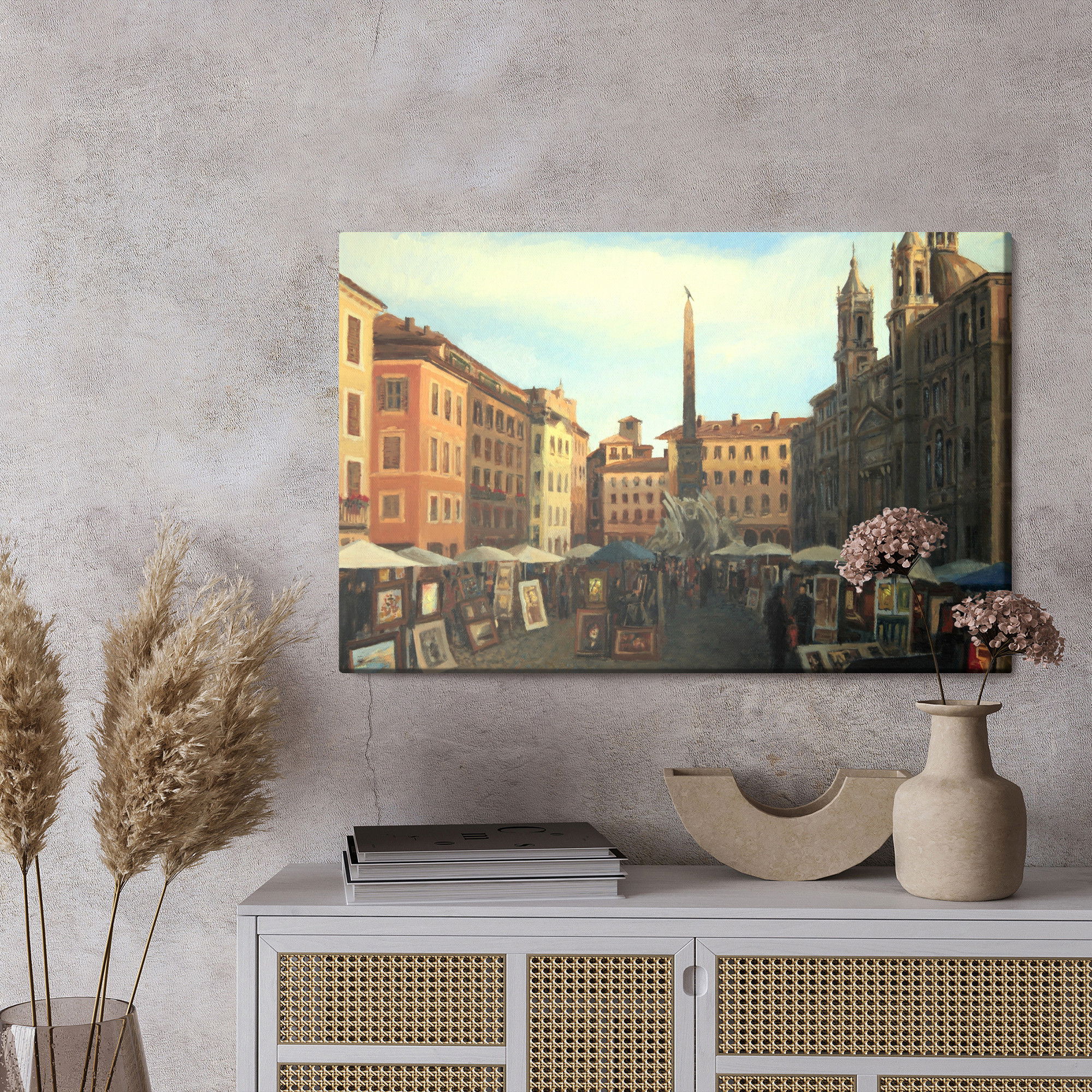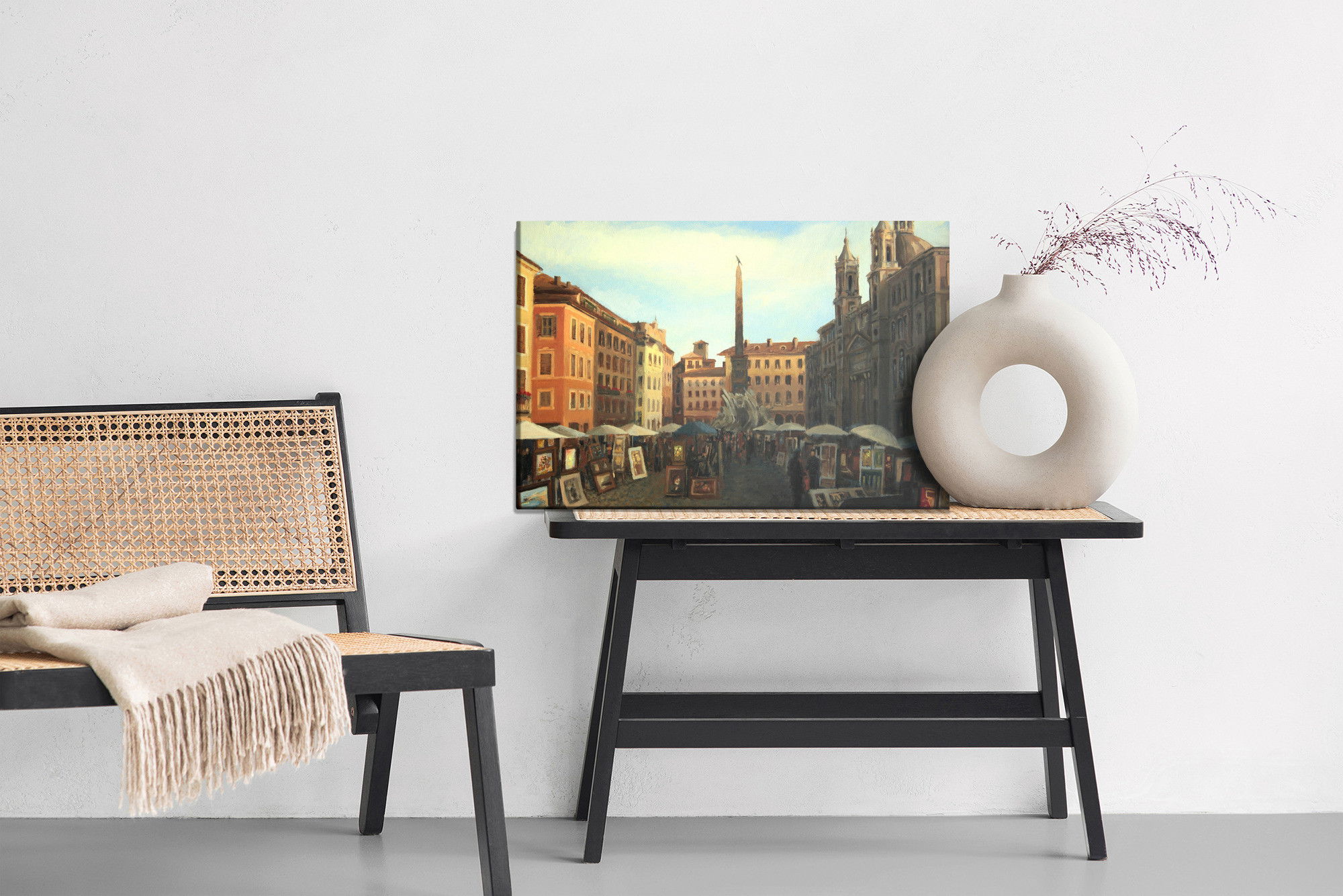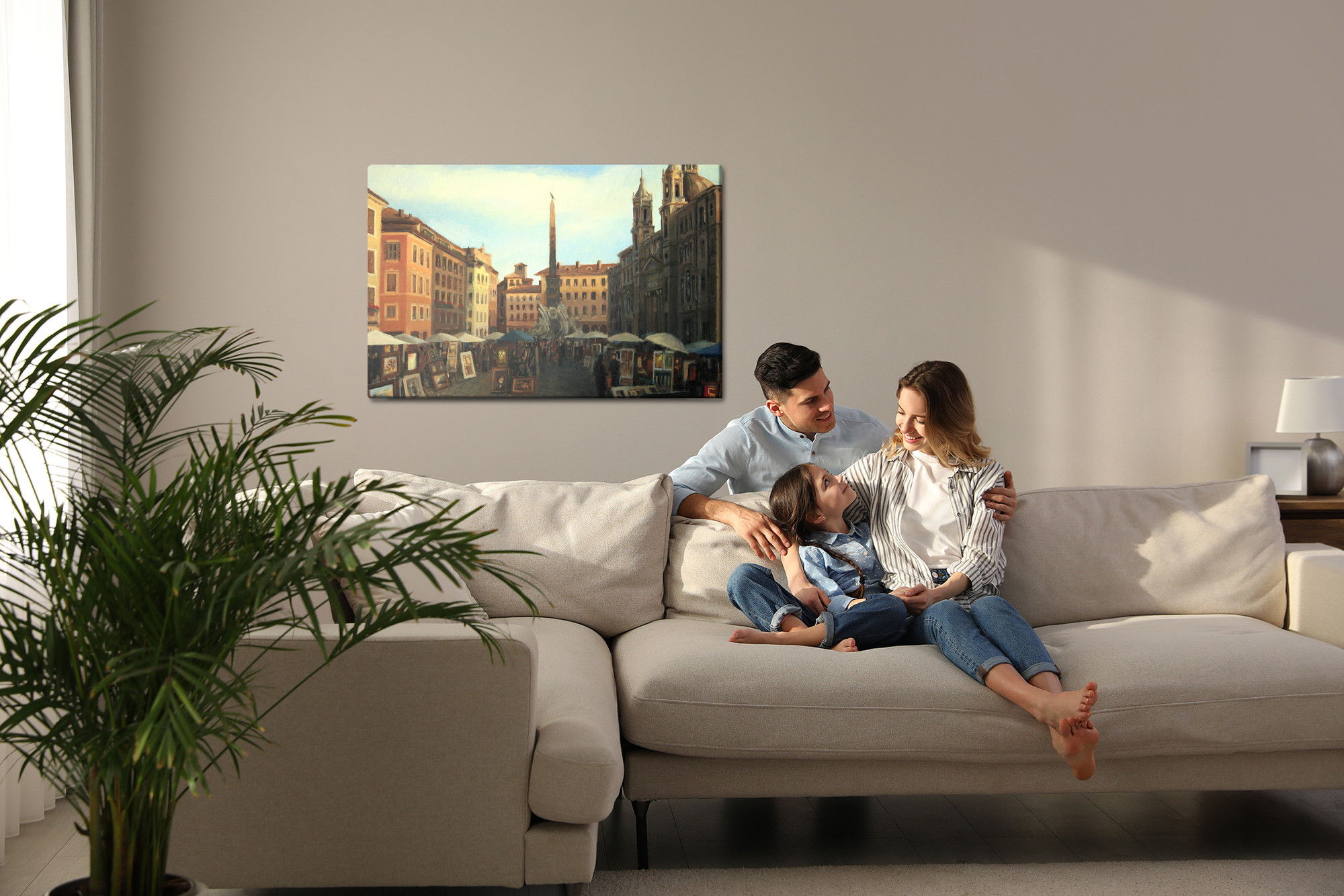 Varje tavla monteras på en massiv fururam. Format upp till 70×50 cm har en ram på 15 mm, medan format från 90×60 cm och uppåt har en ram på 20 mm. Den exakta dukspänningen gör att tavlan håller sin form över tid. Motivet Rome in dark colors trycks runt hela ramen vilket ger ett stilrent galleriuttryck där tavlan är lika vacker från sidan som framifrån. Kombinationen av rak dukspänning, rena linjer och korrekt tryck ger en professionell finish.