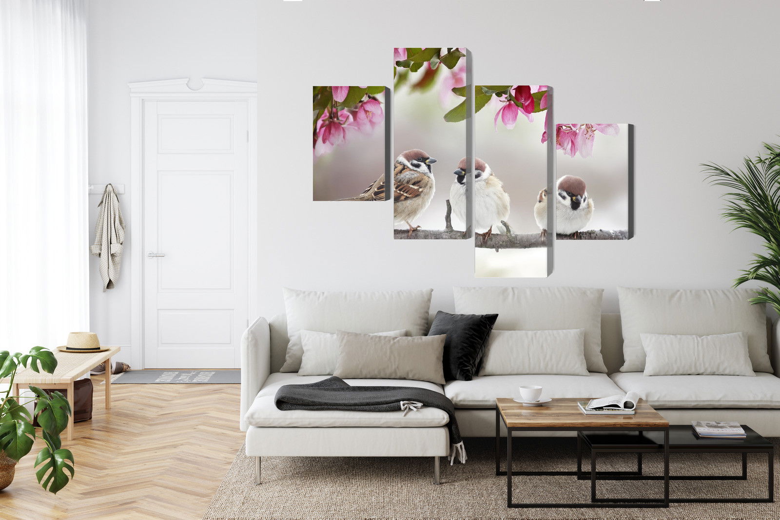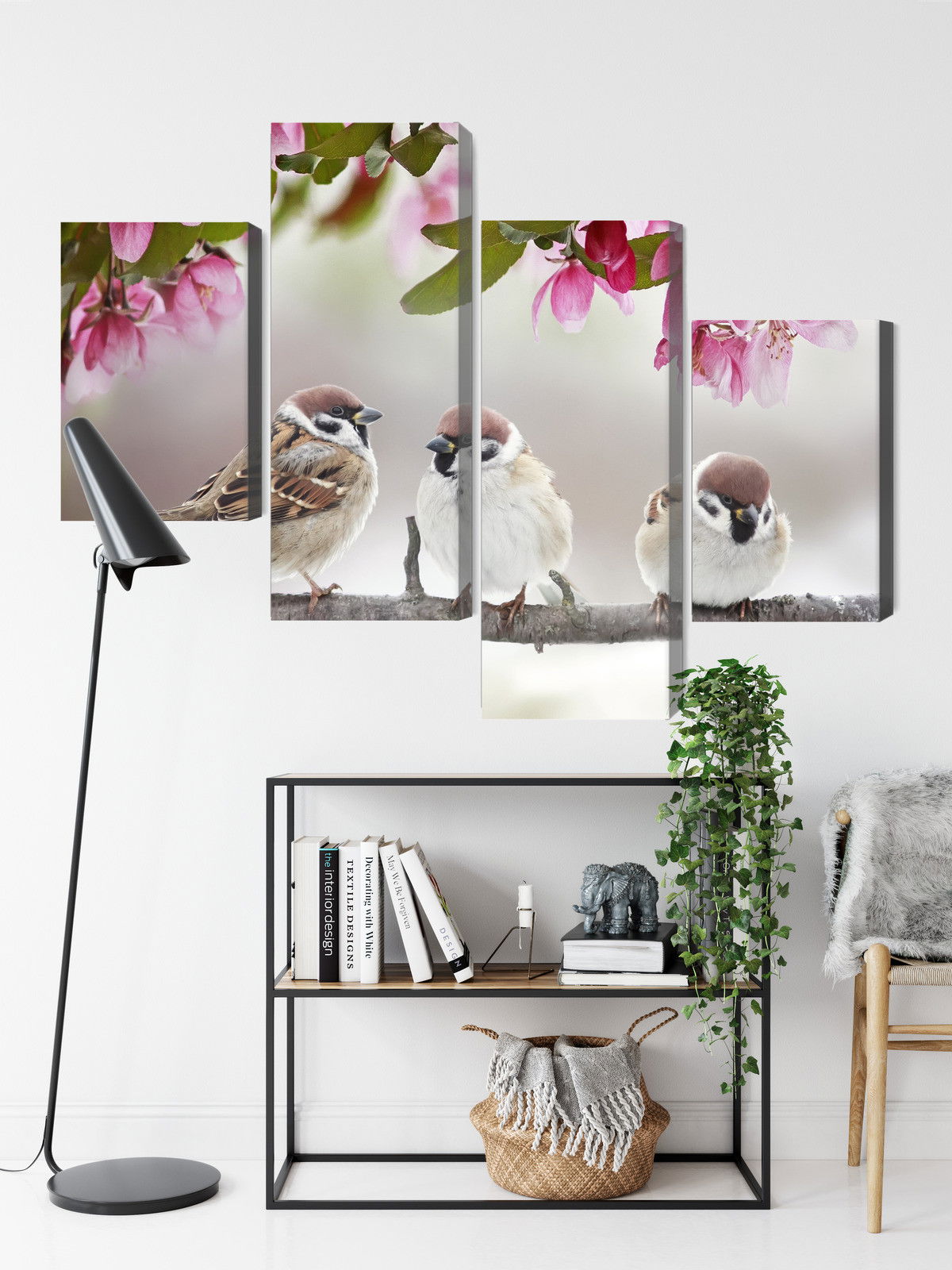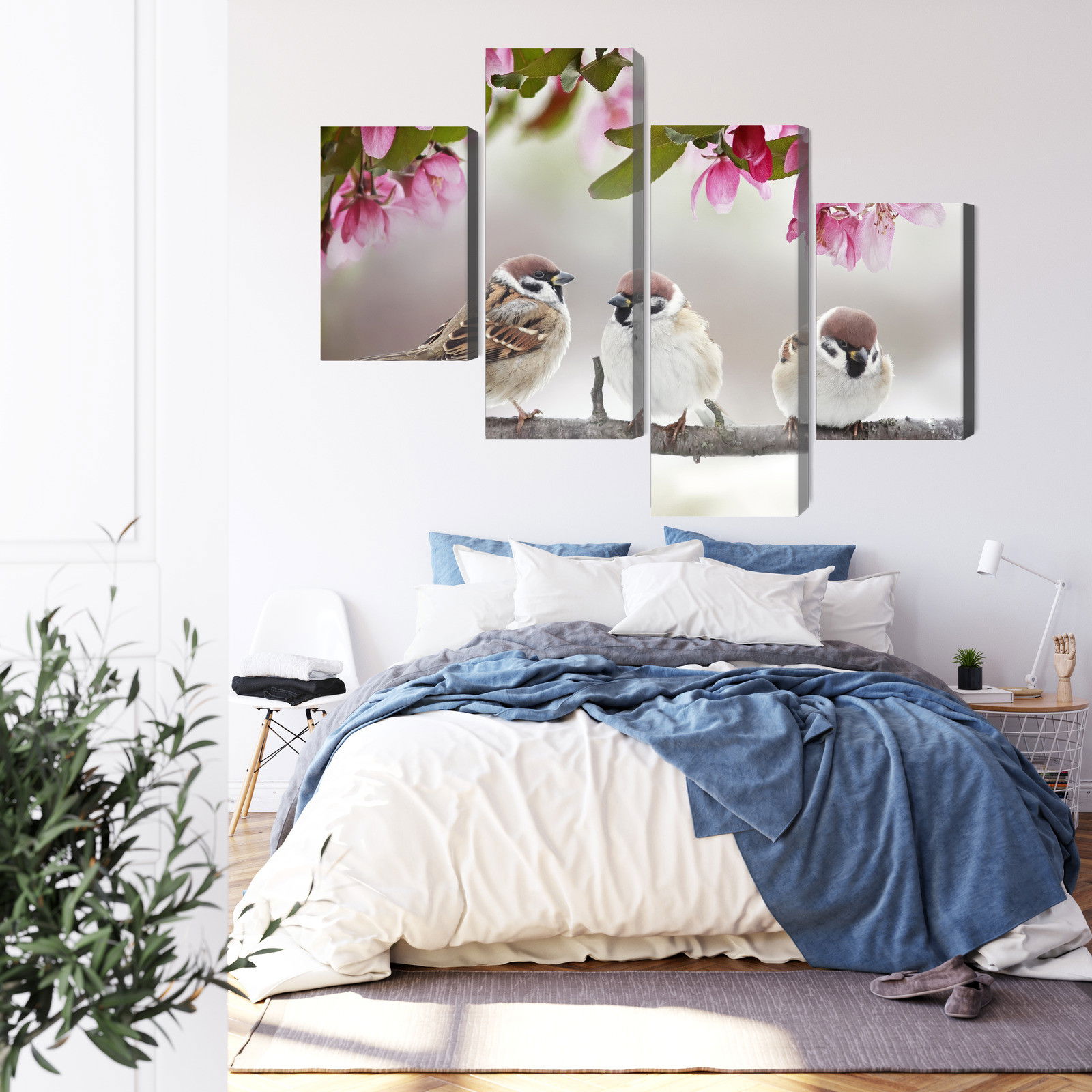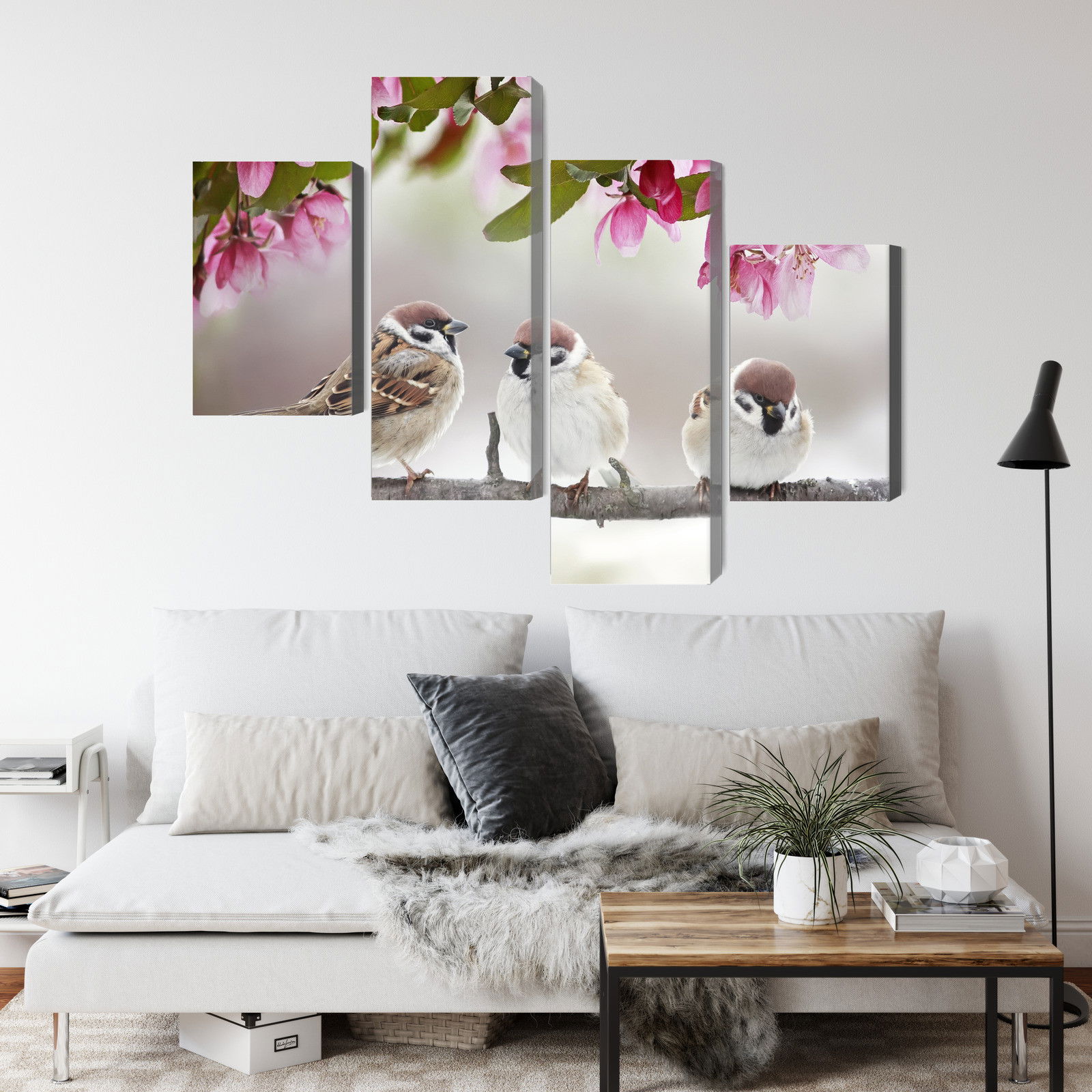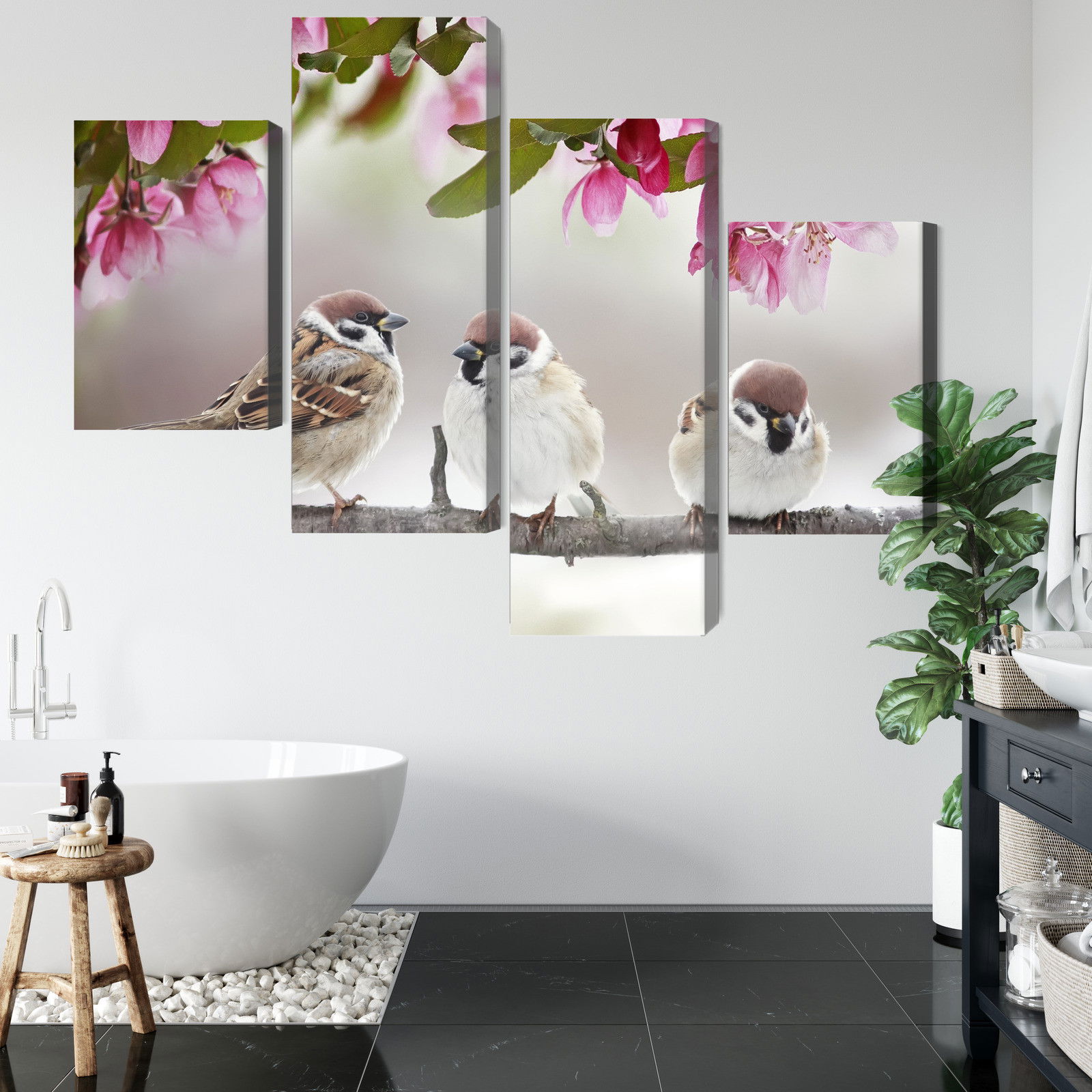 Ljuddämpande tavla – Sparrows among flowers för lugnare rum och mjukare akustik