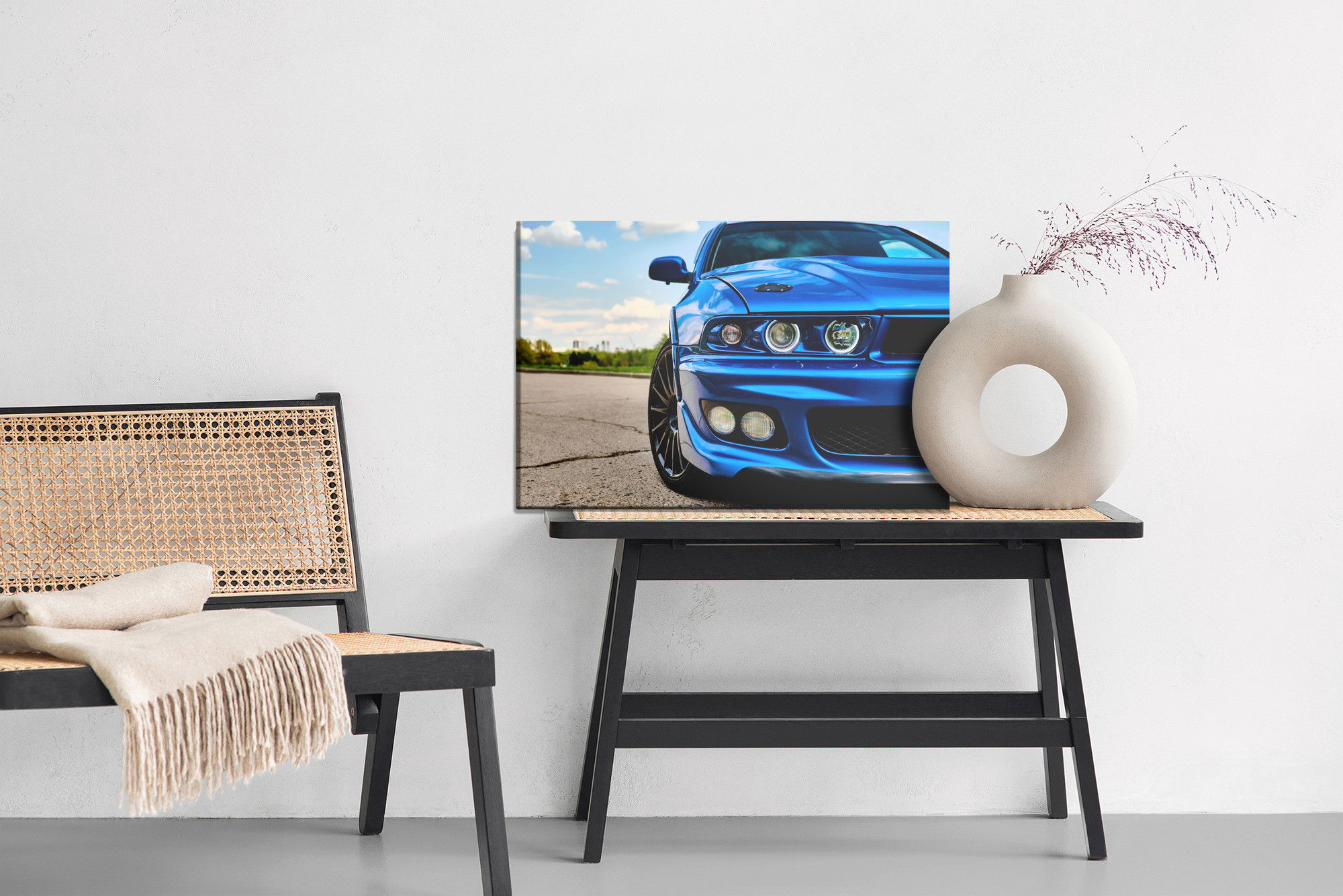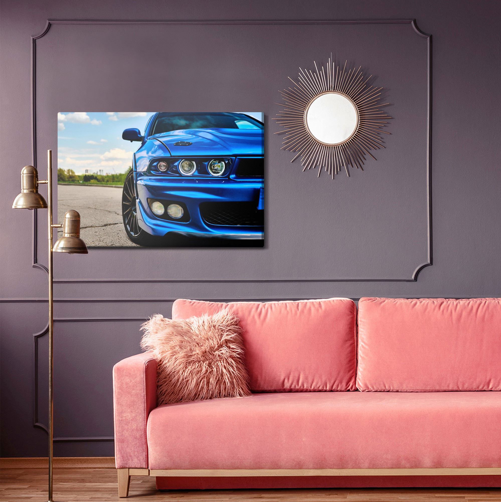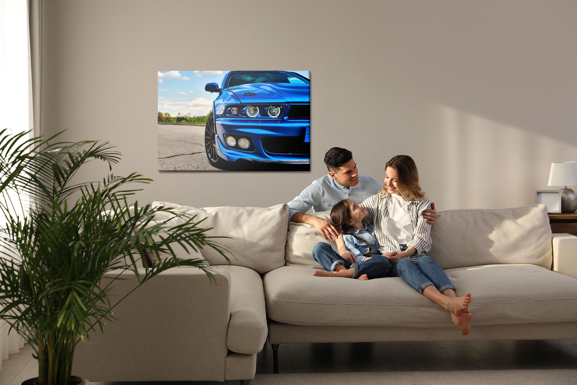 Motivet Sporty blue car and nature återges med hög färgprecision och detaljrikedom tack vare HP Latex-teknologi. Trycket sker med vattenbaserade, luktfria och GREENGUARD Gold-certifierade bläck som ger en upplösning på upp till 300 DPI. Färgerna är UV-beständiga och behåller sin styrka även i ljusa rum, vilket gör tavlan lämplig för både hem- och offentliga miljöer.