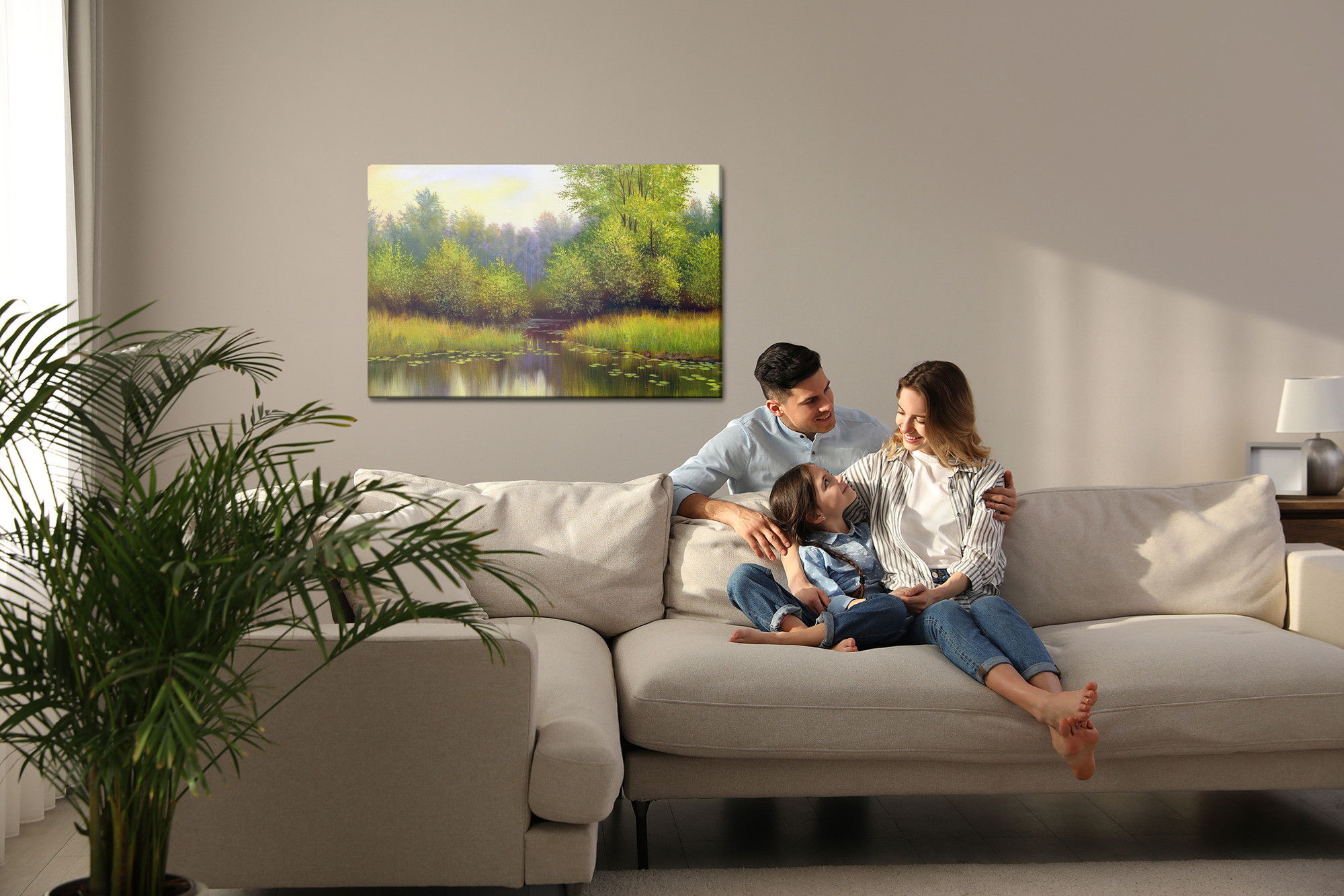 Varje tavla monteras på en massiv fururam. Format upp till 70×50 cm har en ram på 15 mm, medan format från 90×60 cm och uppåt har en ram på 20 mm. Den exakta dukspänningen gör att tavlan håller sin form över tid. Motivet Spring landscape with a lake trycks runt hela ramen vilket ger ett stilrent galleriuttryck där tavlan är lika vacker från sidan som framifrån. Kombinationen av rak dukspänning, rena linjer och korrekt tryck ger en professionell finish.