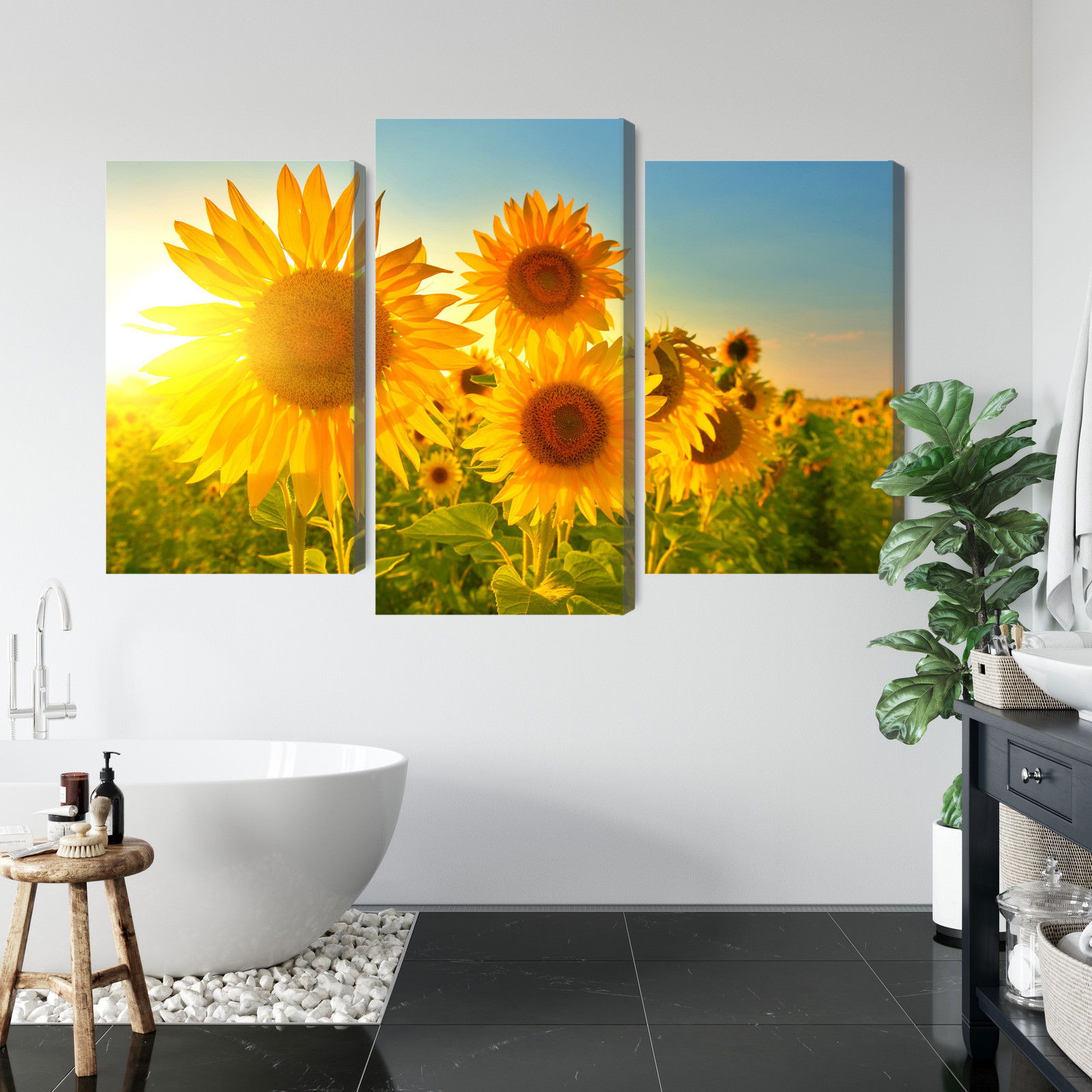 Varje tavla monteras på en massiv fururam. Format upp till 70×50 cm har en ram på 15 mm, medan format från 90×60 cm och uppåt har en ram på 20 mm. Den exakta dukspänningen gör att tavlan håller sin form över tid. Motivet Sunflower field at sunset 3d trycks runt hela ramen vilket ger ett stilrent galleriuttryck där tavlan är lika vacker från sidan som framifrån. Kombinationen av rak dukspänning, rena linjer och korrekt tryck ger en professionell finish.