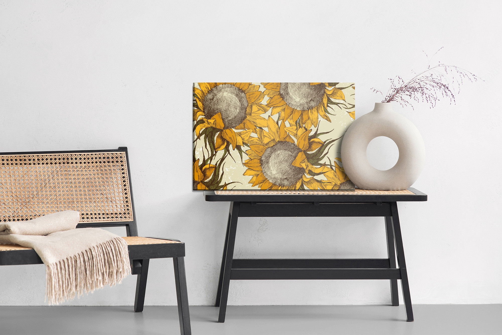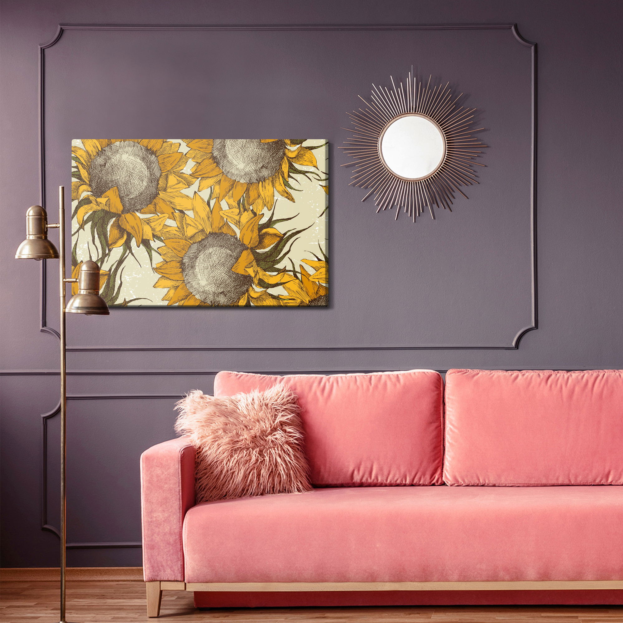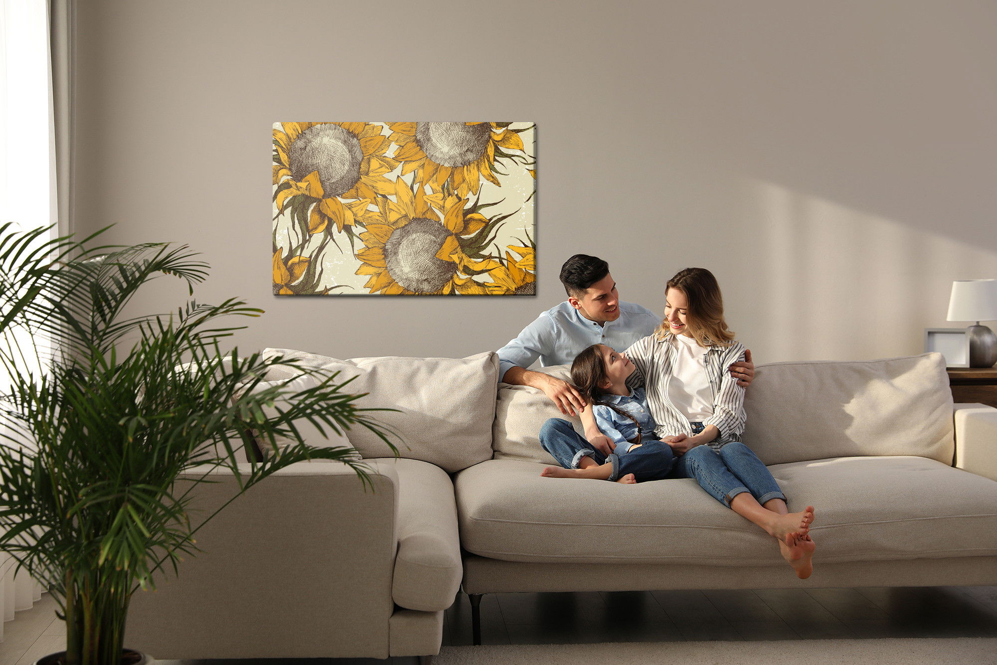 Varje tavla monteras på en massiv fururam. Format upp till 70×50 cm har en ram på 15 mm, medan format från 90×60 cm och uppåt har en ram på 20 mm. Den exakta dukspänningen gör att tavlan håller sin form över tid. Motivet Sunflowers trycks runt hela ramen vilket ger ett stilrent galleriuttryck där tavlan är lika vacker från sidan som framifrån. Kombinationen av rak dukspänning, rena linjer och korrekt tryck ger en professionell finish.