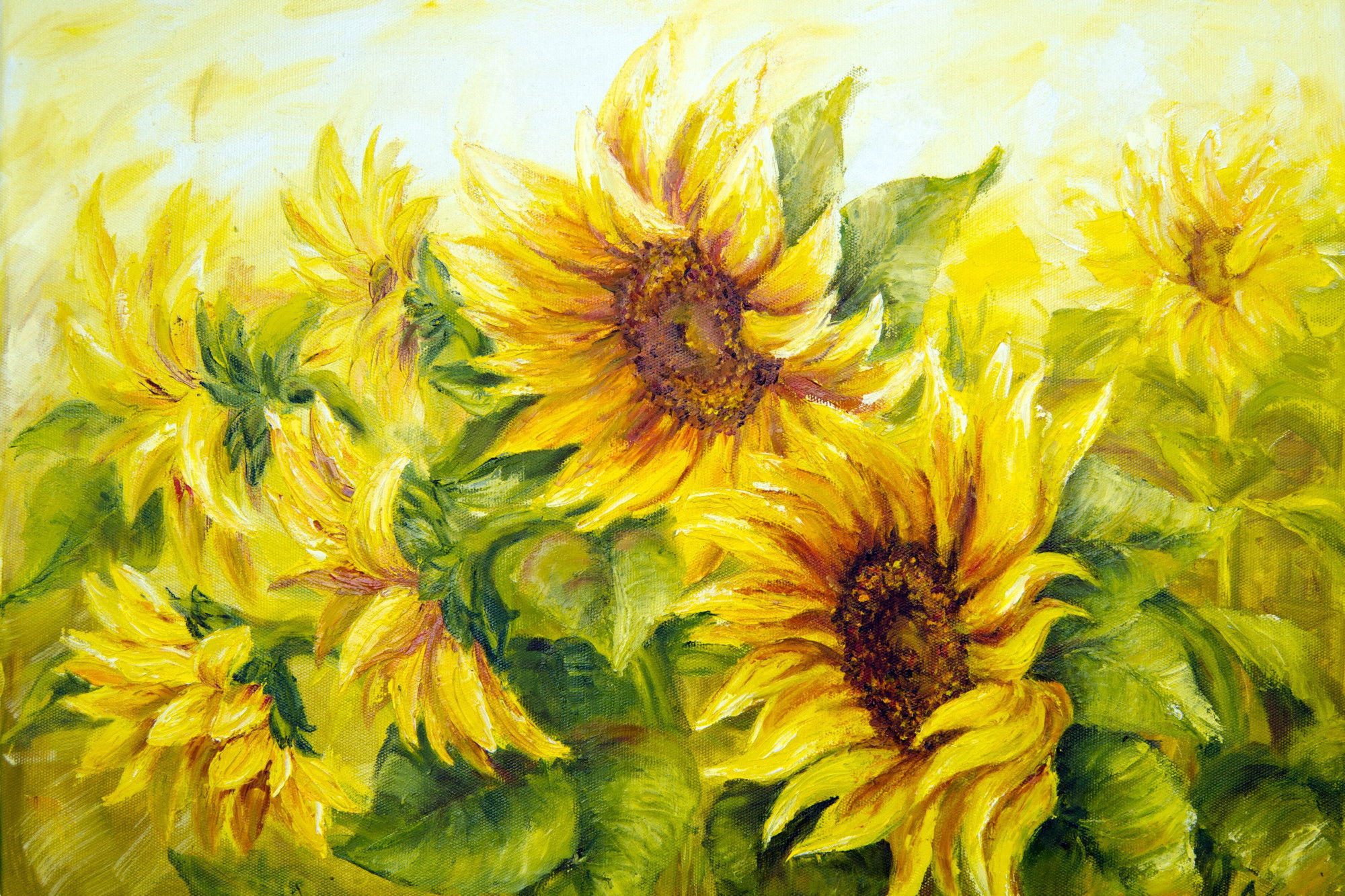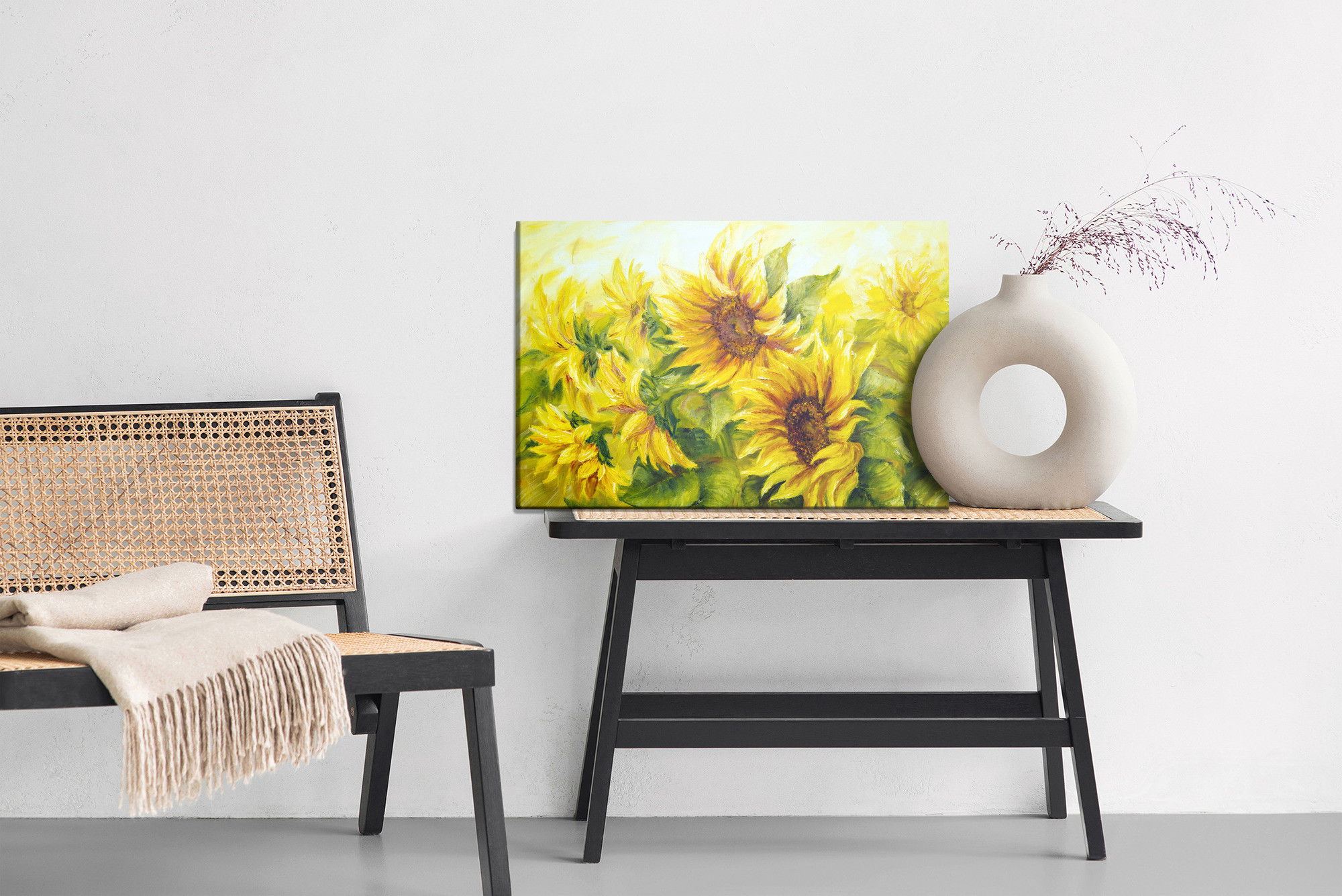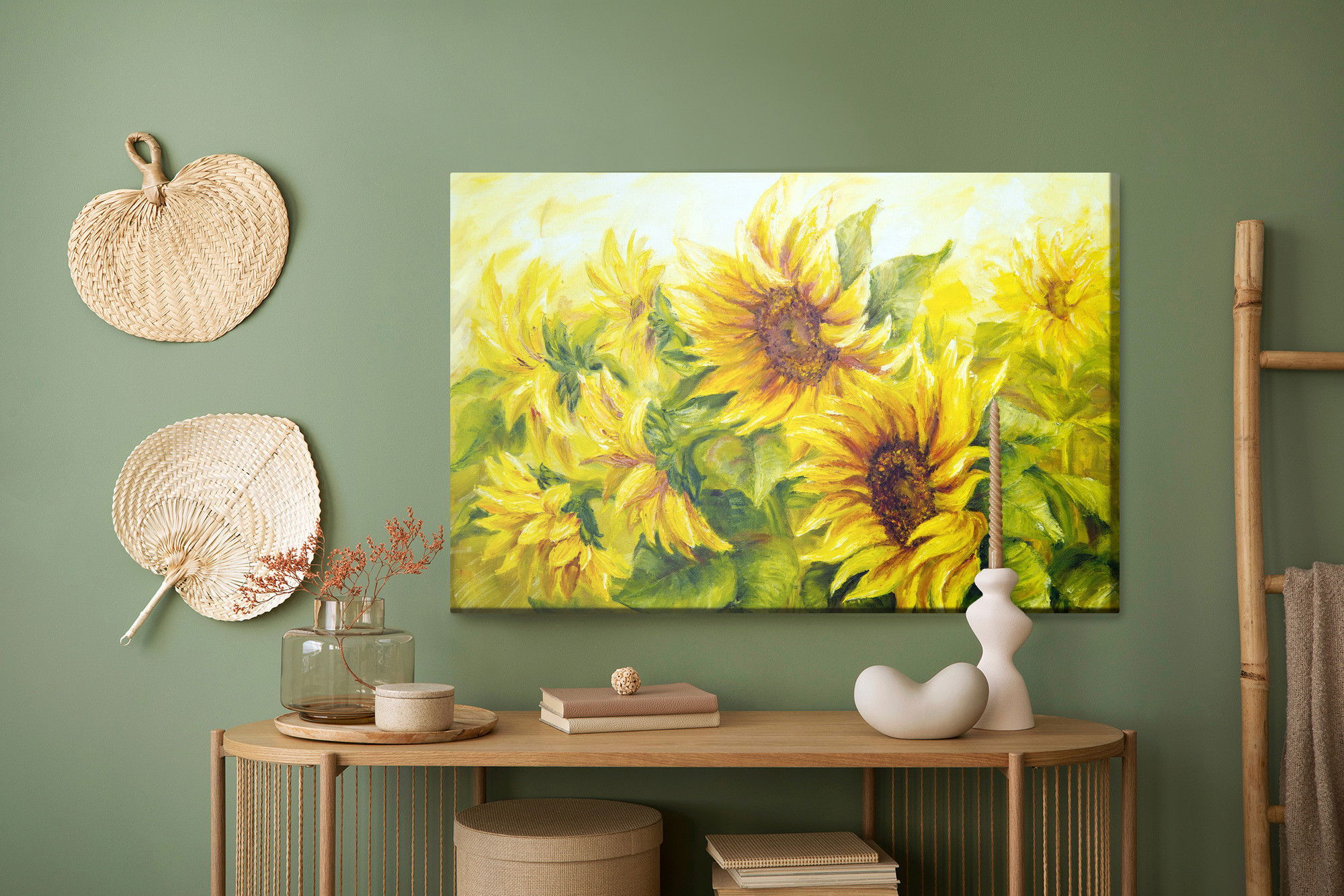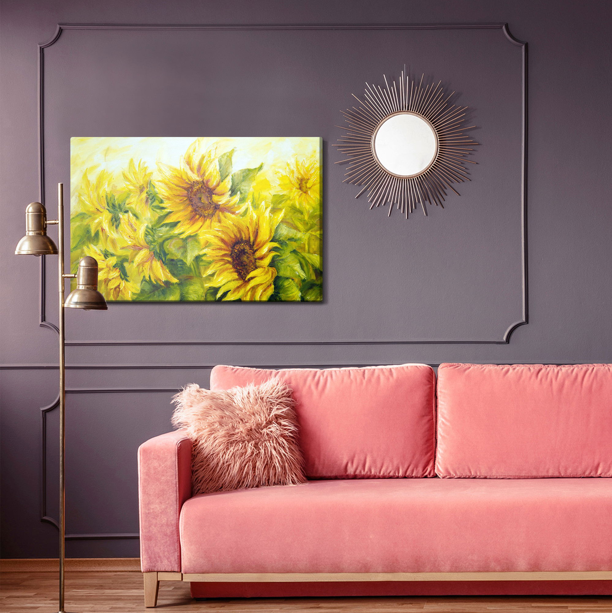 Varje tavla monteras på en massiv fururam. Format upp till 70×50 cm har en ram på 15 mm, medan format från 90×60 cm och uppåt har en ram på 20 mm. Den exakta dukspänningen gör att tavlan håller sin form över tid. Motivet Sunflowers with leaves as trycks runt hela ramen vilket ger ett stilrent galleriuttryck där tavlan är lika vacker från sidan som framifrån. Kombinationen av rak dukspänning, rena linjer och korrekt tryck ger en professionell finish.