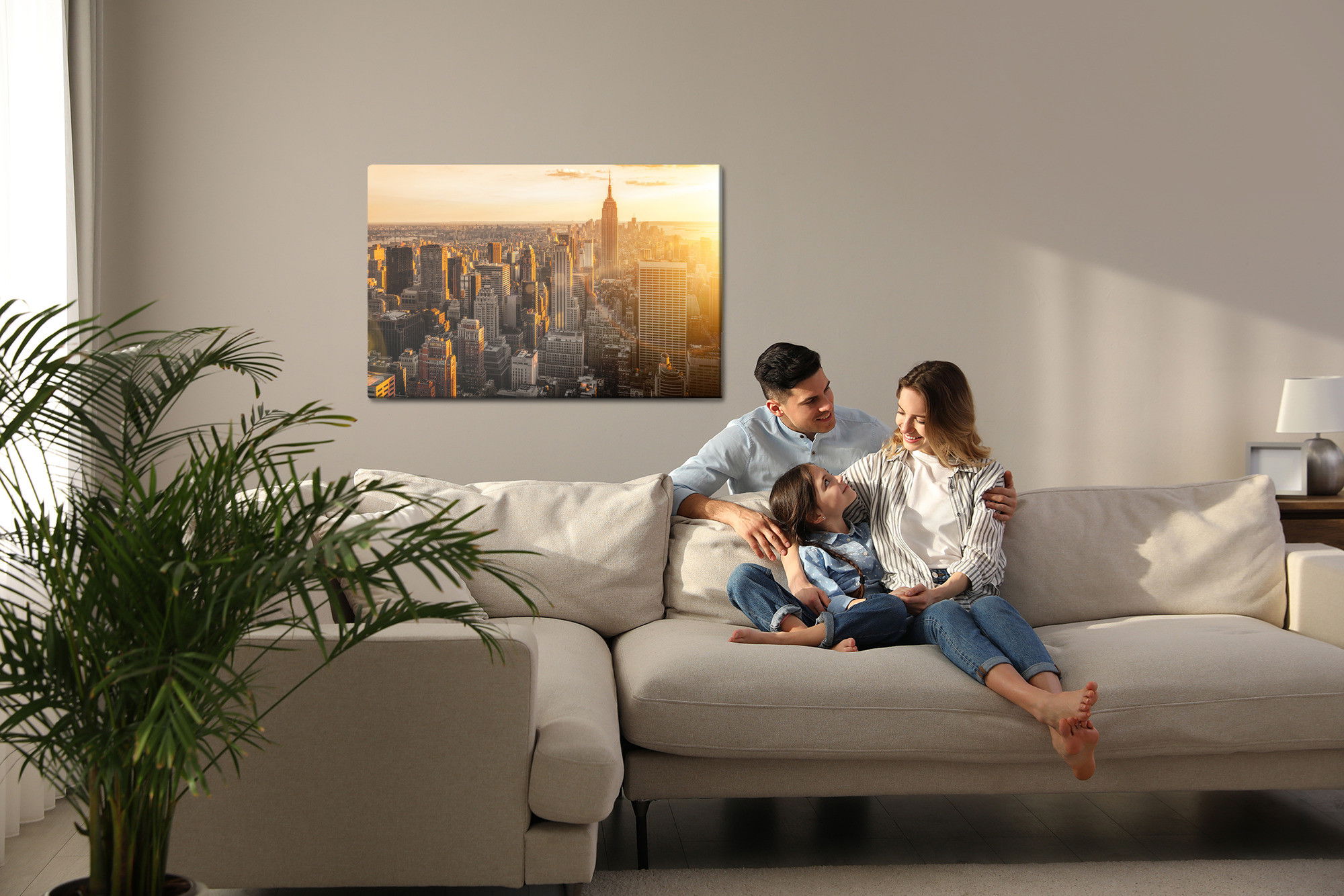 Varje tavla monteras på en massiv fururam. Format upp till 70×50 cm har en ram på 15 mm, medan format från 90×60 cm och uppåt har en ram på 20 mm. Den exakta dukspänningen gör att tavlan håller sin form över tid. Motivet Sunset in New York trycks runt hela ramen vilket ger ett stilrent galleriuttryck där tavlan är lika vacker från sidan som framifrån. Kombinationen av rak dukspänning, rena linjer och korrekt tryck ger en professionell finish.