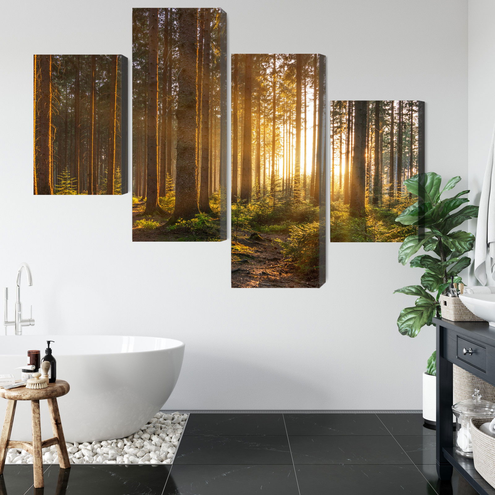 Varje tavla monteras på en massiv fururam. Format upp till 70×50 cm har en ram på 15 mm, medan format från 90×60 cm och uppåt har en ram på 20 mm. Den exakta dukspänningen gör att tavlan håller sin form över tid. Motivet Sunset in the forest trycks runt hela ramen vilket ger ett stilrent galleriuttryck där tavlan är lika vacker från sidan som framifrån. Kombinationen av rak dukspänning, rena linjer och korrekt tryck ger en professionell finish.