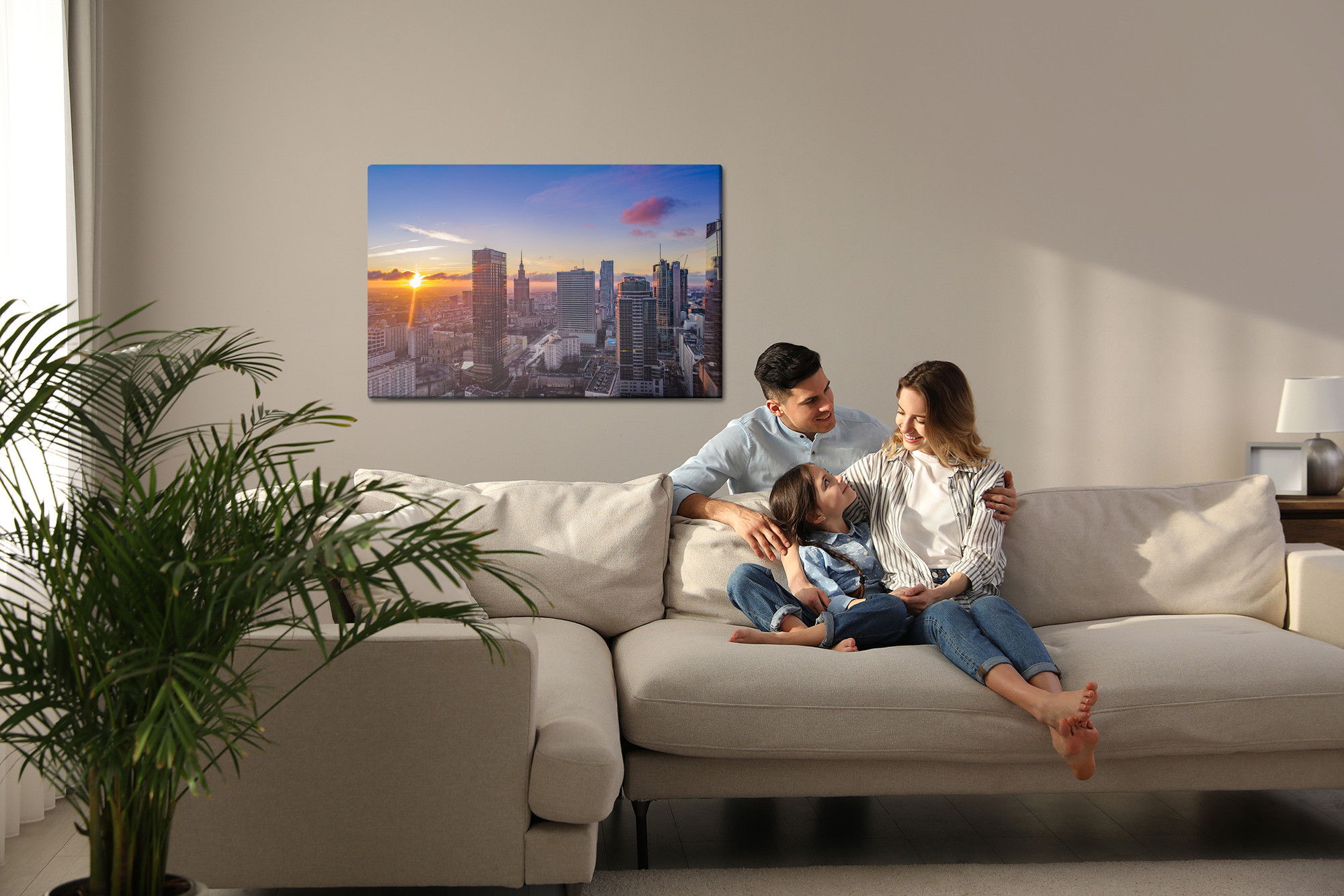 Varje tavla monteras på en massiv fururam. Format upp till 70×50 cm har en ram på 15 mm, medan format från 90×60 cm och uppåt har en ram på 20 mm. Den exakta dukspänningen gör att tavlan håller sin form över tid. Motivet Sunset in Warsaw trycks runt hela ramen vilket ger ett stilrent galleriuttryck där tavlan är lika vacker från sidan som framifrån. Kombinationen av rak dukspänning, rena linjer och korrekt tryck ger en professionell finish.