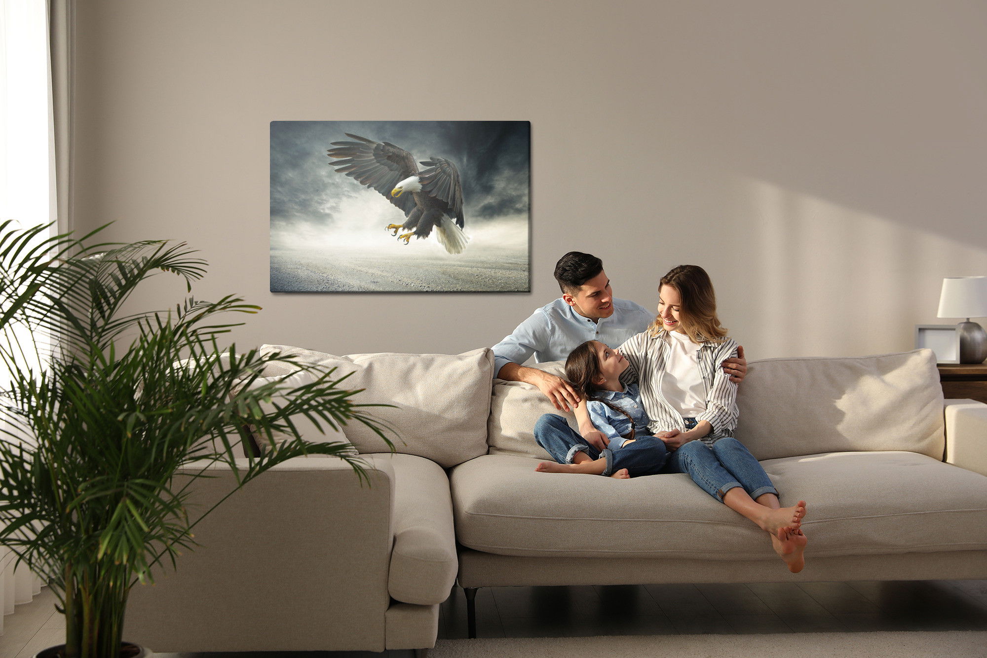 Motivet The eagle during the storm återges med hög färgprecision och detaljrikedom tack vare HP Latex-teknologi. Trycket sker med vattenbaserade, luktfria och GREENGUARD Gold-certifierade bläck som ger en upplösning på upp till 300 DPI. Färgerna är UV-beständiga och behåller sin styrka även i ljusa rum, vilket gör tavlan lämplig för både hem- och offentliga miljöer.