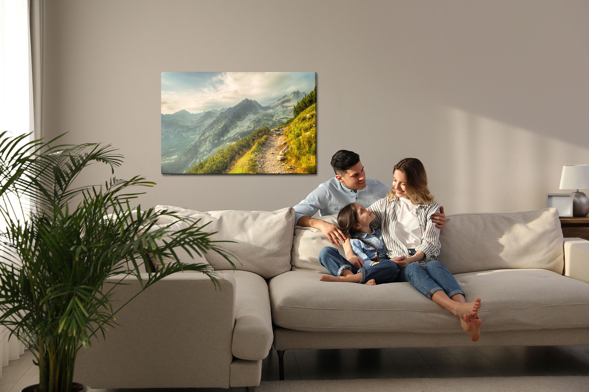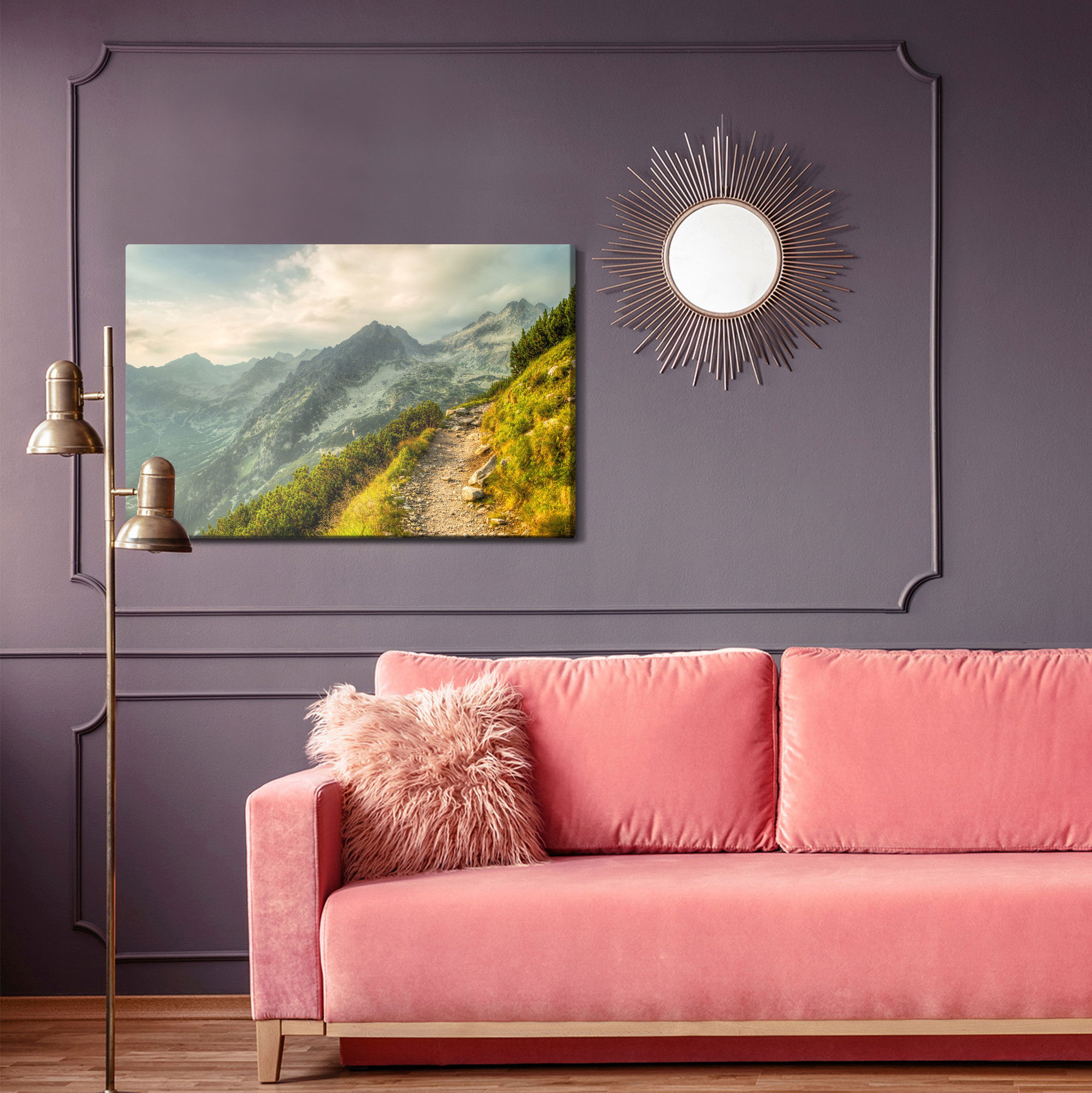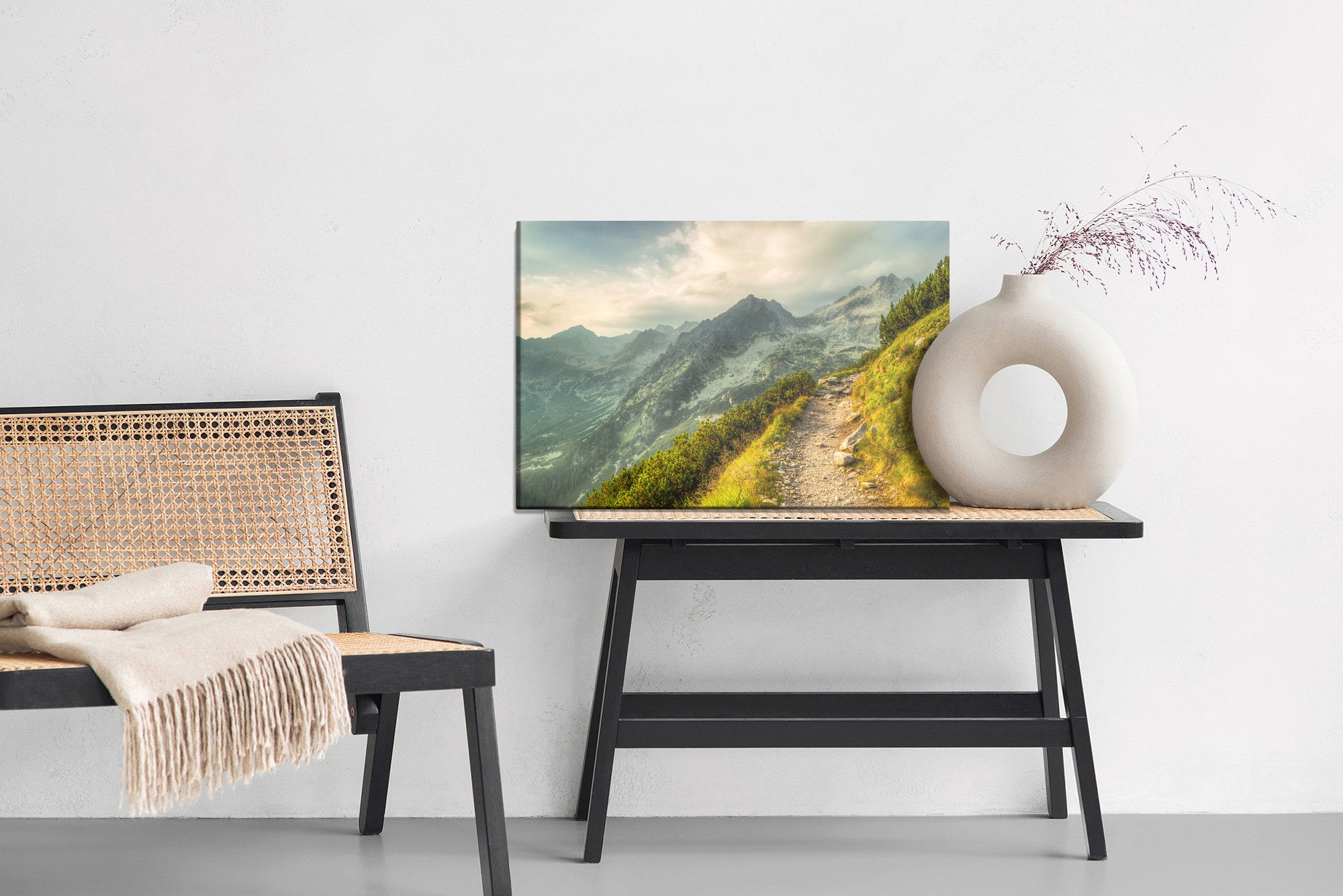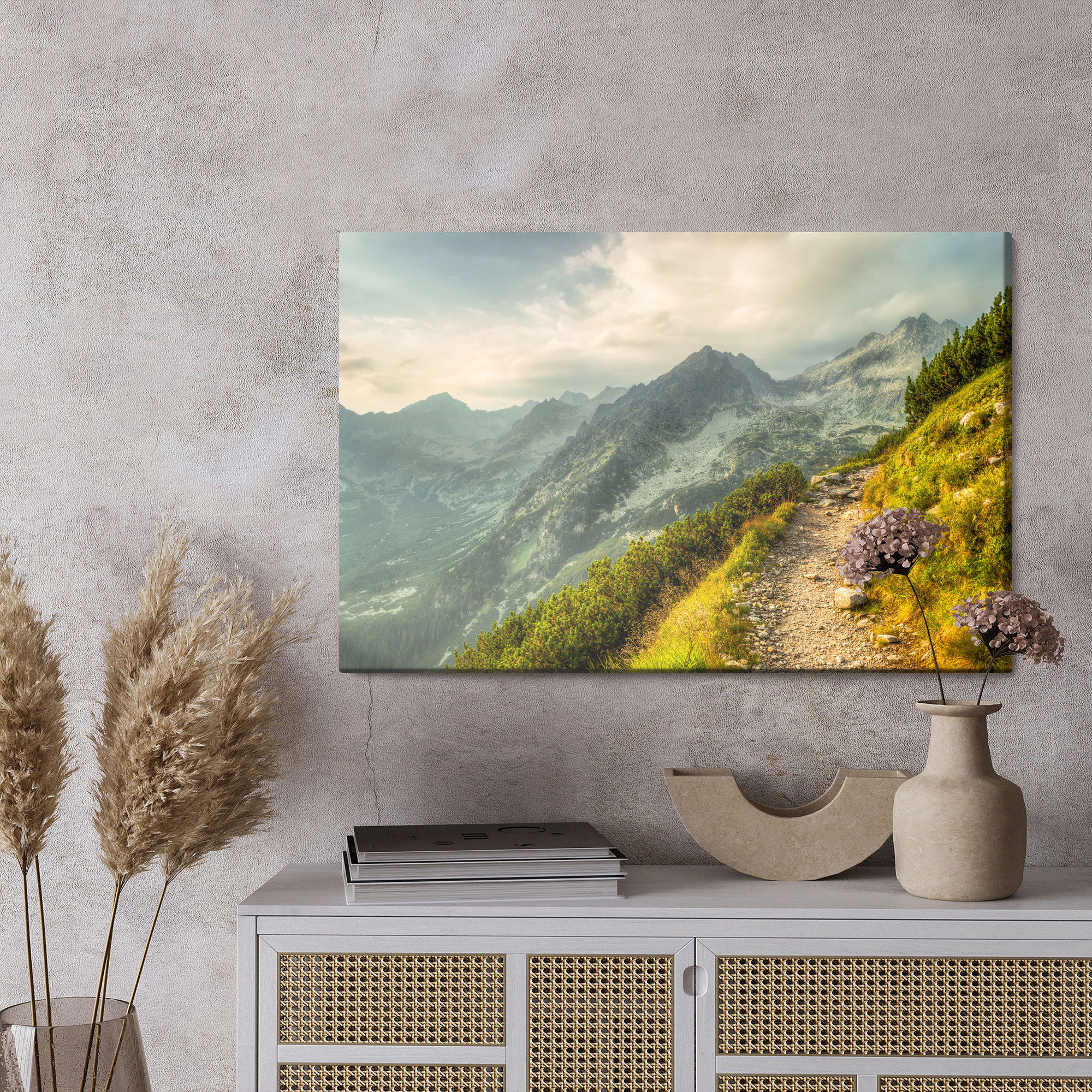 Varje tavla monteras på en massiv fururam. Format upp till 70×50 cm har en ram på 15 mm, medan format från 90×60 cm och uppåt har en ram på 20 mm. Den exakta dukspänningen gör att tavlan håller sin form över tid. Motivet The path in the mountains trycks runt hela ramen vilket ger ett stilrent galleriuttryck där tavlan är lika vacker från sidan som framifrån. Kombinationen av rak dukspänning, rena linjer och korrekt tryck ger en professionell finish.
