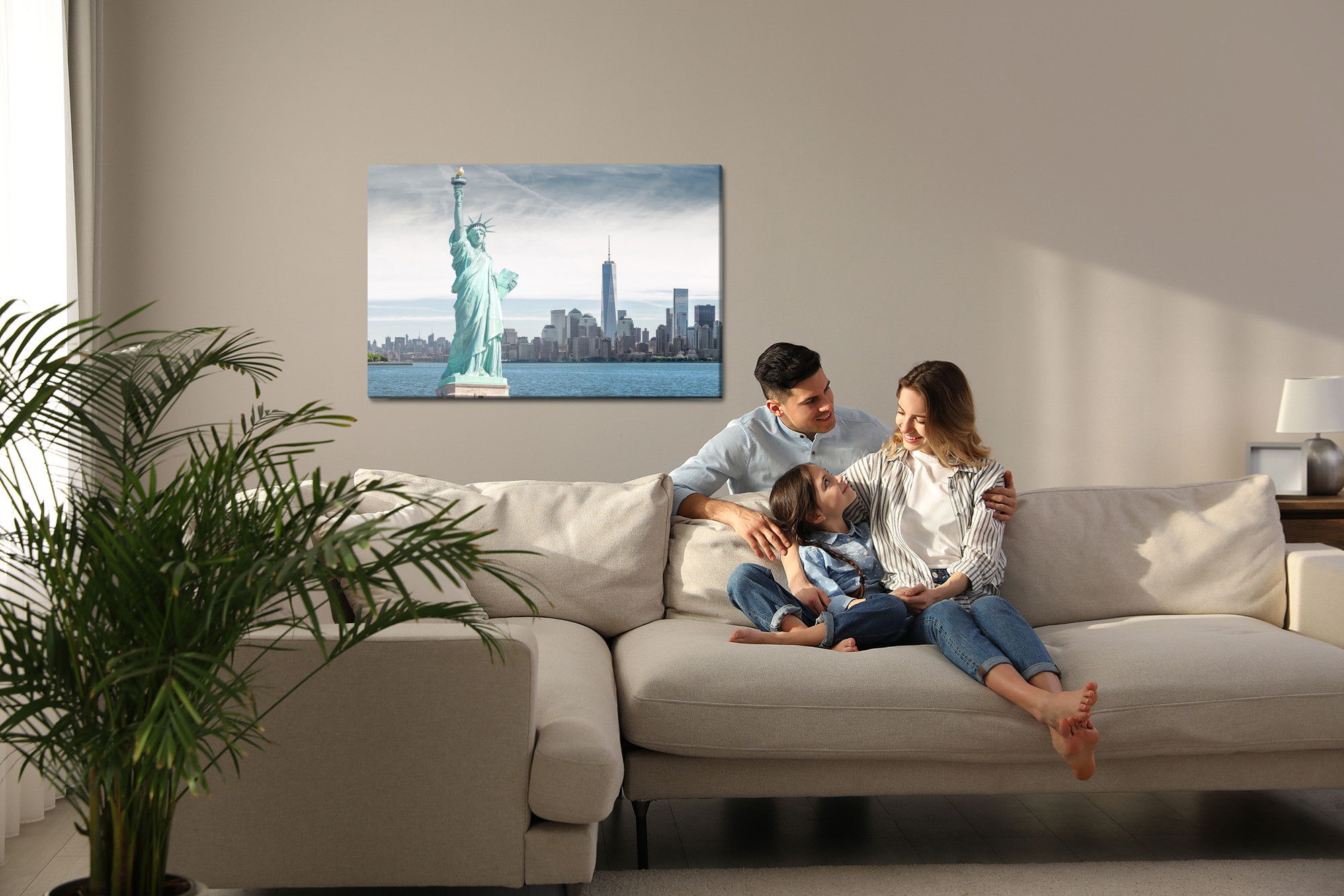 Varje tavla monteras på en massiv fururam. Format upp till 70×50 cm har en ram på 15 mm, medan format från 90×60 cm och uppåt har en ram på 20 mm. Den exakta dukspänningen gör att tavlan håller sin form över tid. Motivet The statue of liberty trycks runt hela ramen vilket ger ett stilrent galleriuttryck där tavlan är lika vacker från sidan som framifrån. Kombinationen av rak dukspänning, rena linjer och korrekt tryck ger en professionell finish.