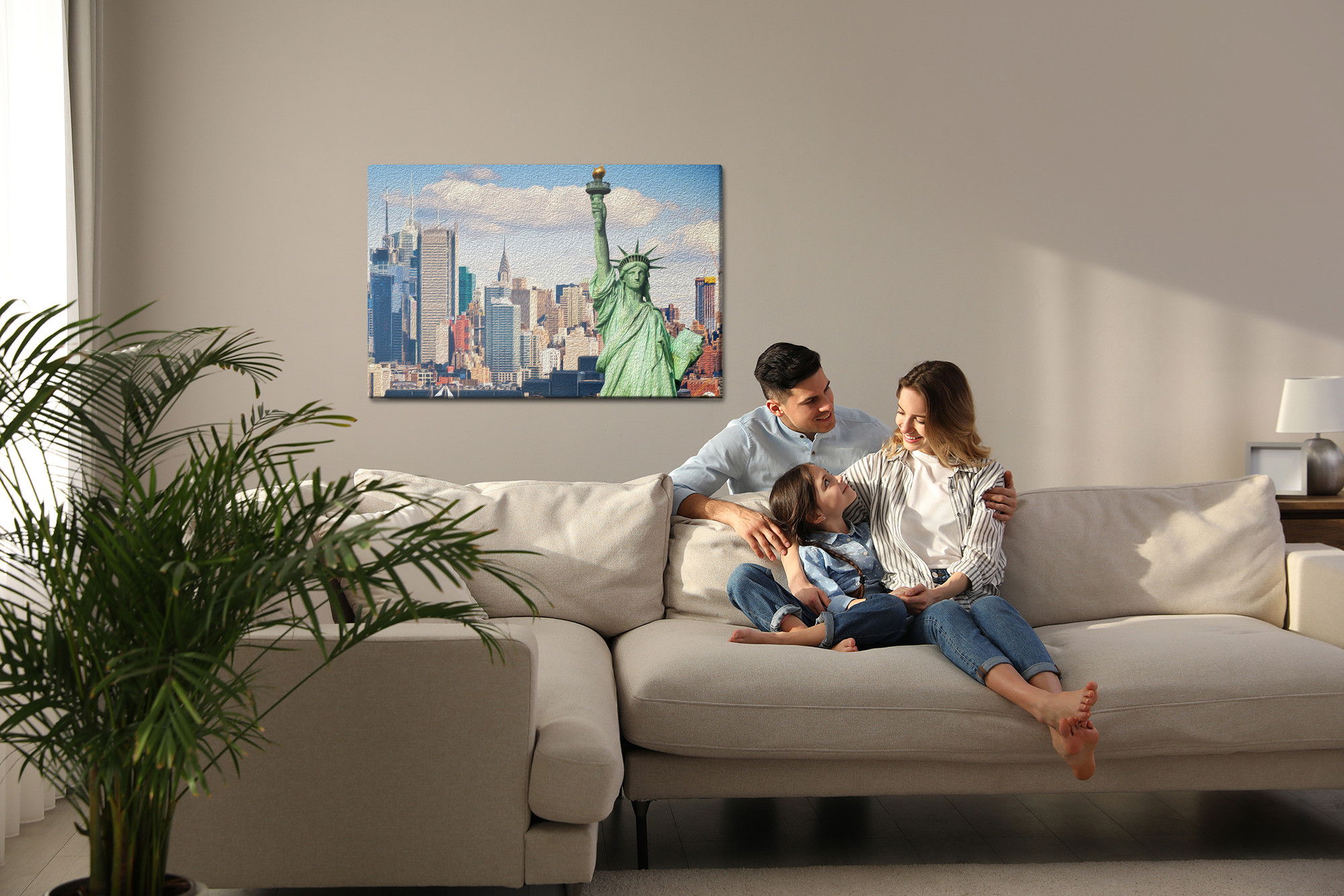 Varje tavla monteras på en massiv fururam. Format upp till 70×50 cm har en ram på 15 mm, medan format från 90×60 cm och uppåt har en ram på 20 mm. Den exakta dukspänningen gör att tavlan håller sin form över tid. Motivet The statue of liberty in new trycks runt hela ramen vilket ger ett stilrent galleriuttryck där tavlan är lika vacker från sidan som framifrån. Kombinationen av rak dukspänning, rena linjer och korrekt tryck ger en professionell finish.