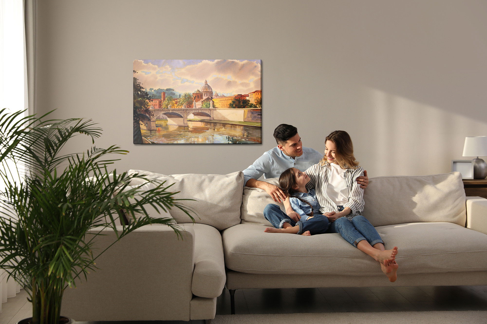Varje tavla monteras på en massiv fururam. Format upp till 70×50 cm har en ram på 15 mm, medan format från 90×60 cm och uppåt har en ram på 20 mm. Den exakta dukspänningen gör att tavlan håller sin form över tid. Motivet The tiber river in Rome trycks runt hela ramen vilket ger ett stilrent galleriuttryck där tavlan är lika vacker från sidan som framifrån. Kombinationen av rak dukspänning, rena linjer och korrekt tryck ger en professionell finish.