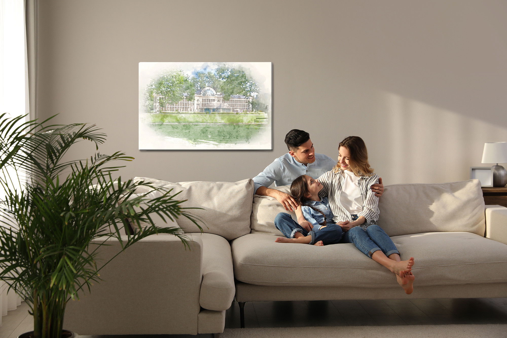 Varje tavla monteras på en massiv fururam. Format upp till 70×50 cm har en ram på 15 mm, medan format från 90×60 cm och uppåt har en ram på 20 mm. Den exakta dukspänningen gör att tavlan håller sin form över tid. Motivet The watercolor royal lazienki trycks runt hela ramen vilket ger ett stilrent galleriuttryck där tavlan är lika vacker från sidan som framifrån. Kombinationen av rak dukspänning, rena linjer och korrekt tryck ger en professionell finish.