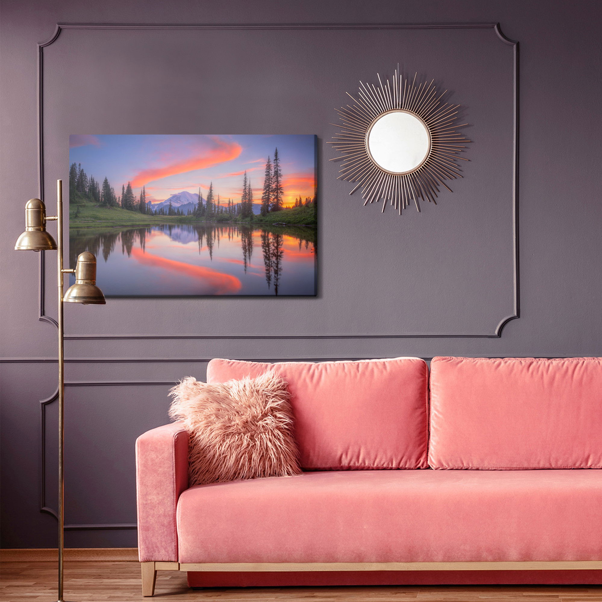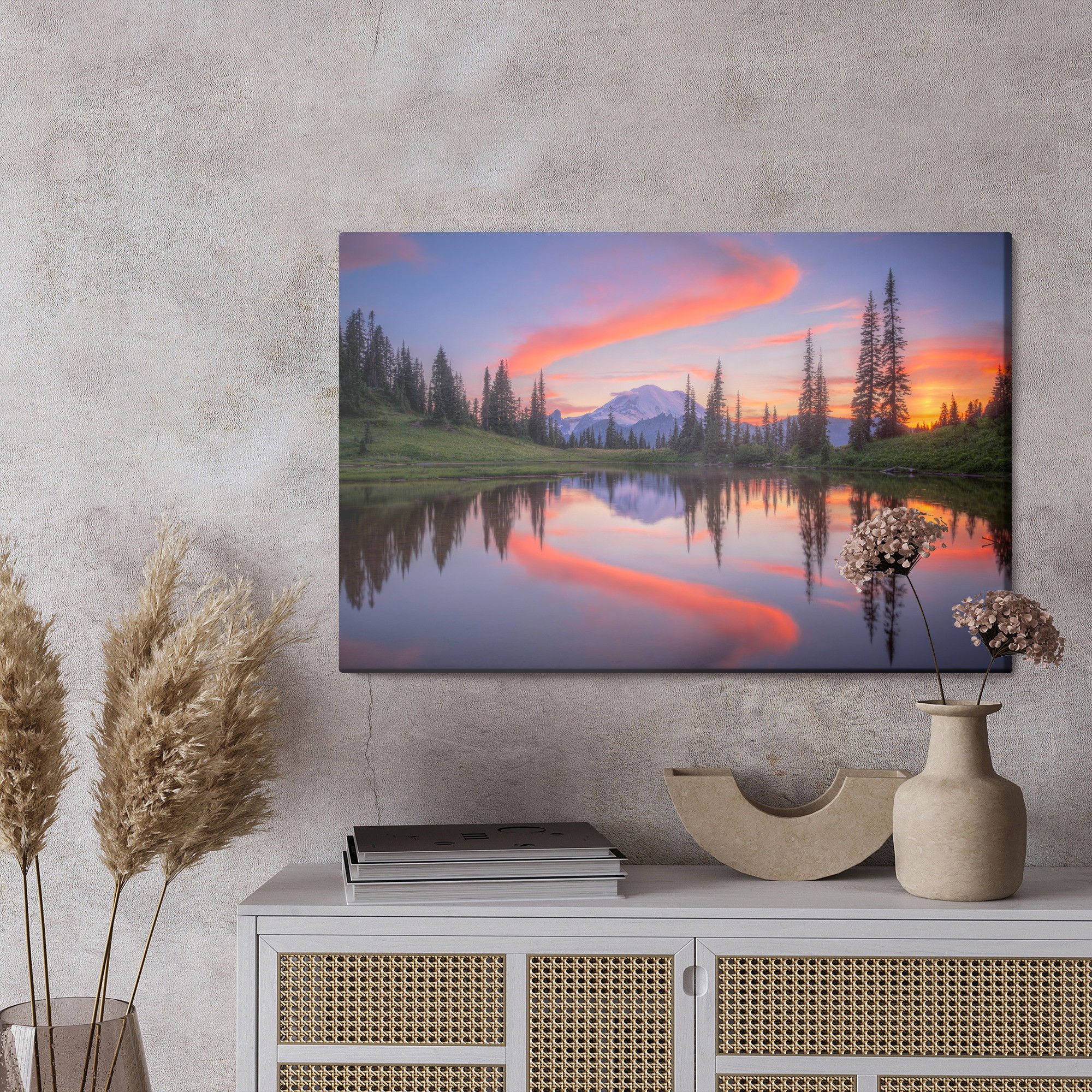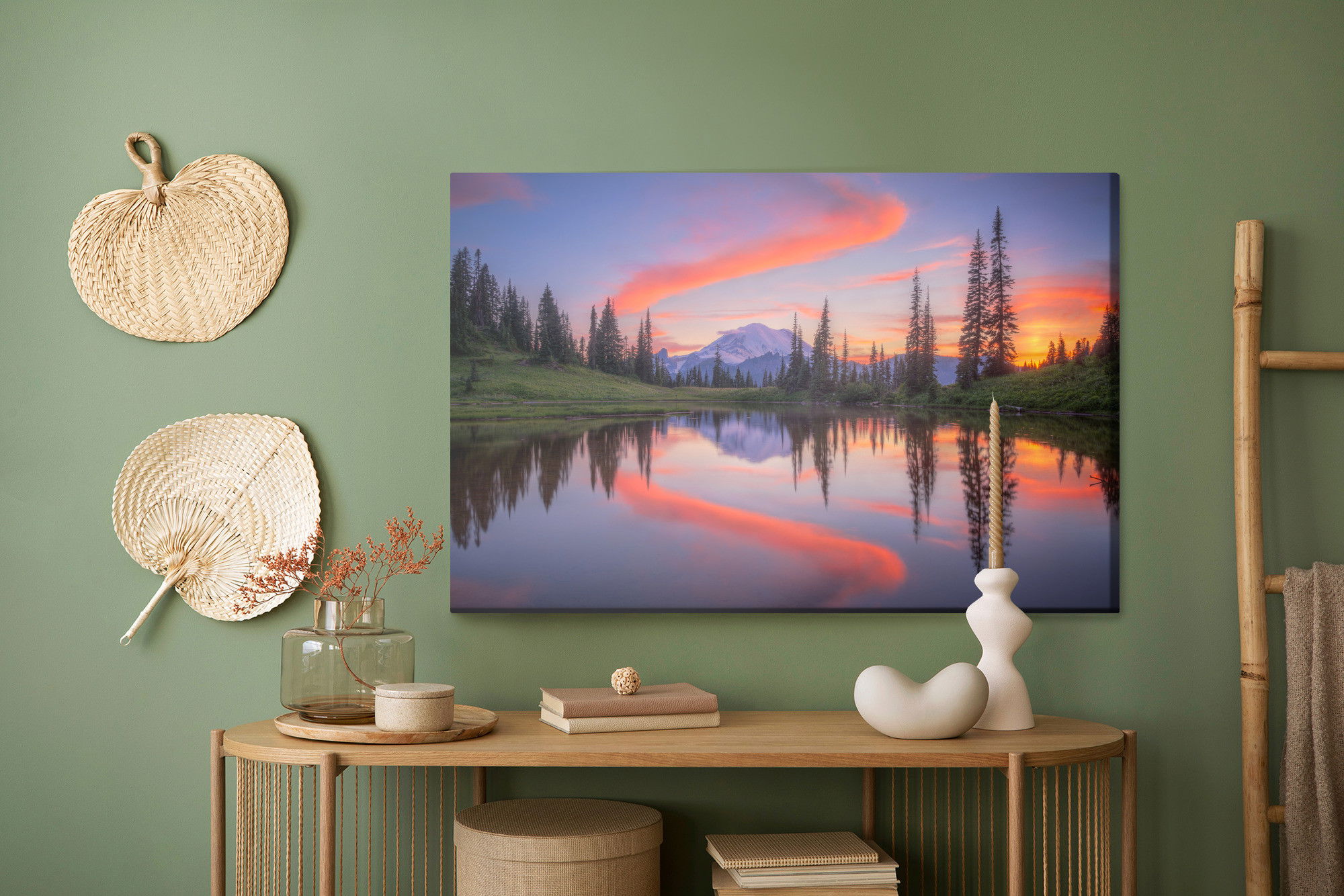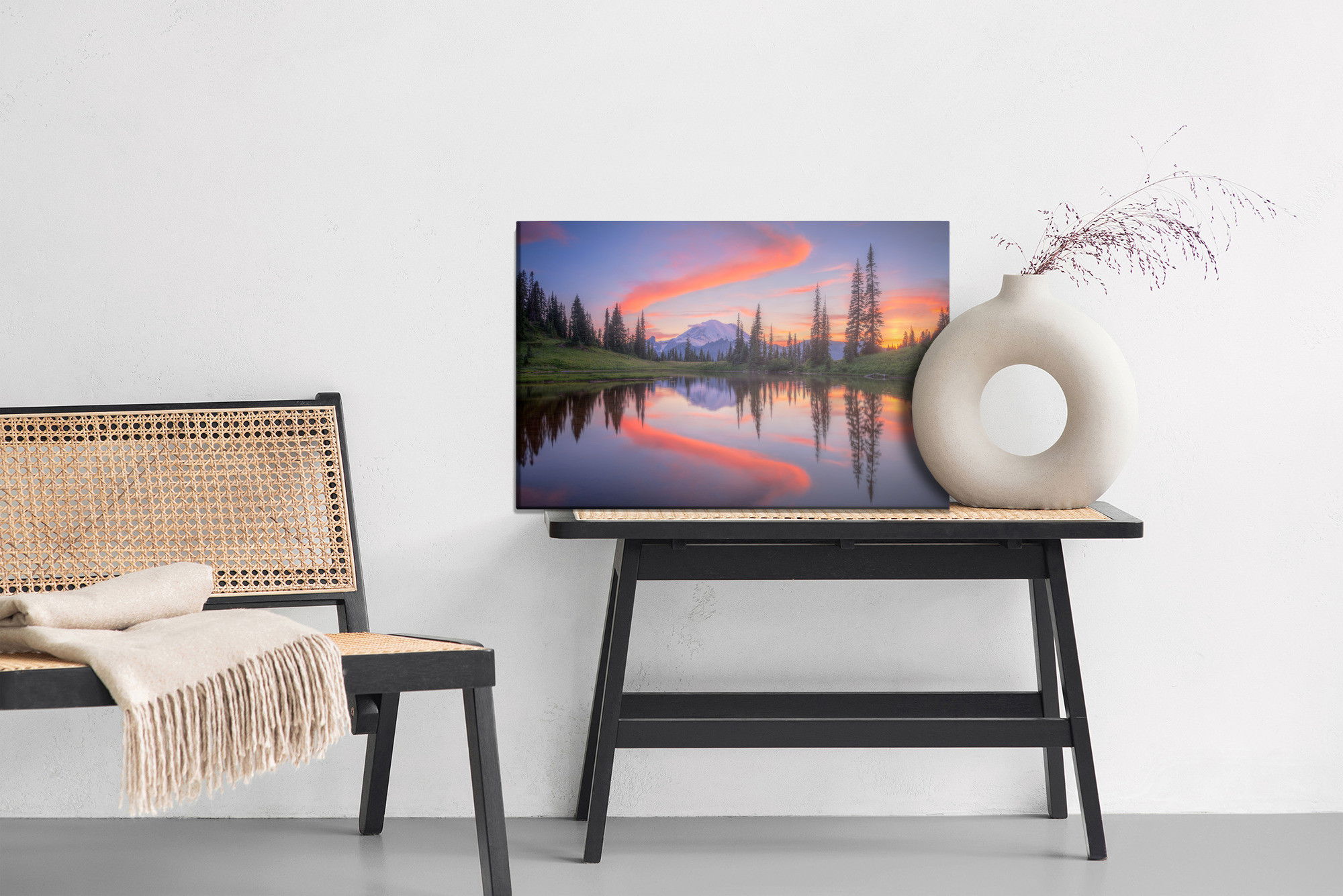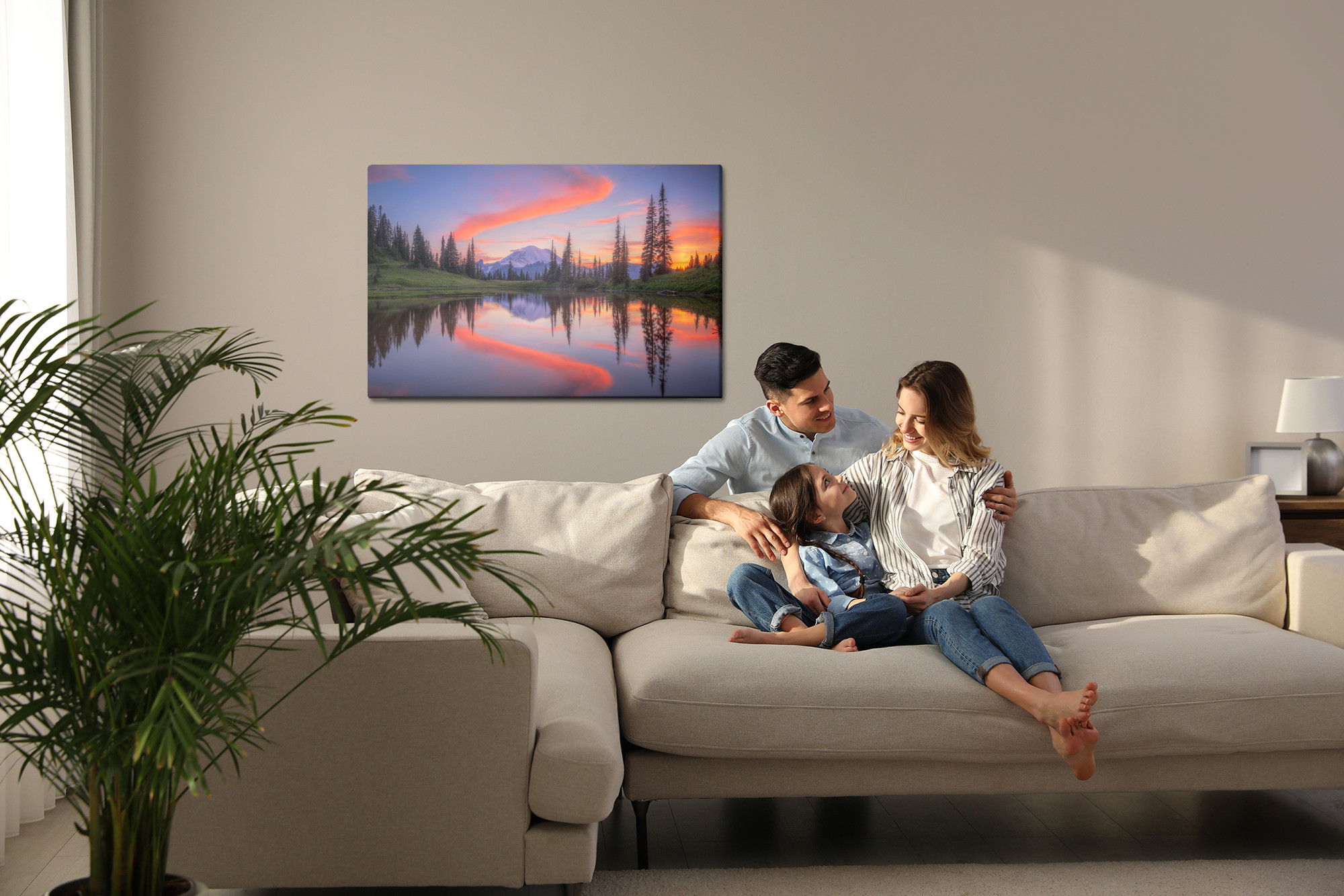 Varje tavla monteras på en massiv fururam. Format upp till 70×50 cm har en ram på 15 mm, medan format från 90×60 cm och uppåt har en ram på 20 mm. Den exakta dukspänningen gör att tavlan håller sin form över tid. Motivet Tipsoo lake, Usa trycks runt hela ramen vilket ger ett stilrent galleriuttryck där tavlan är lika vacker från sidan som framifrån. Kombinationen av rak dukspänning, rena linjer och korrekt tryck ger en professionell finish.