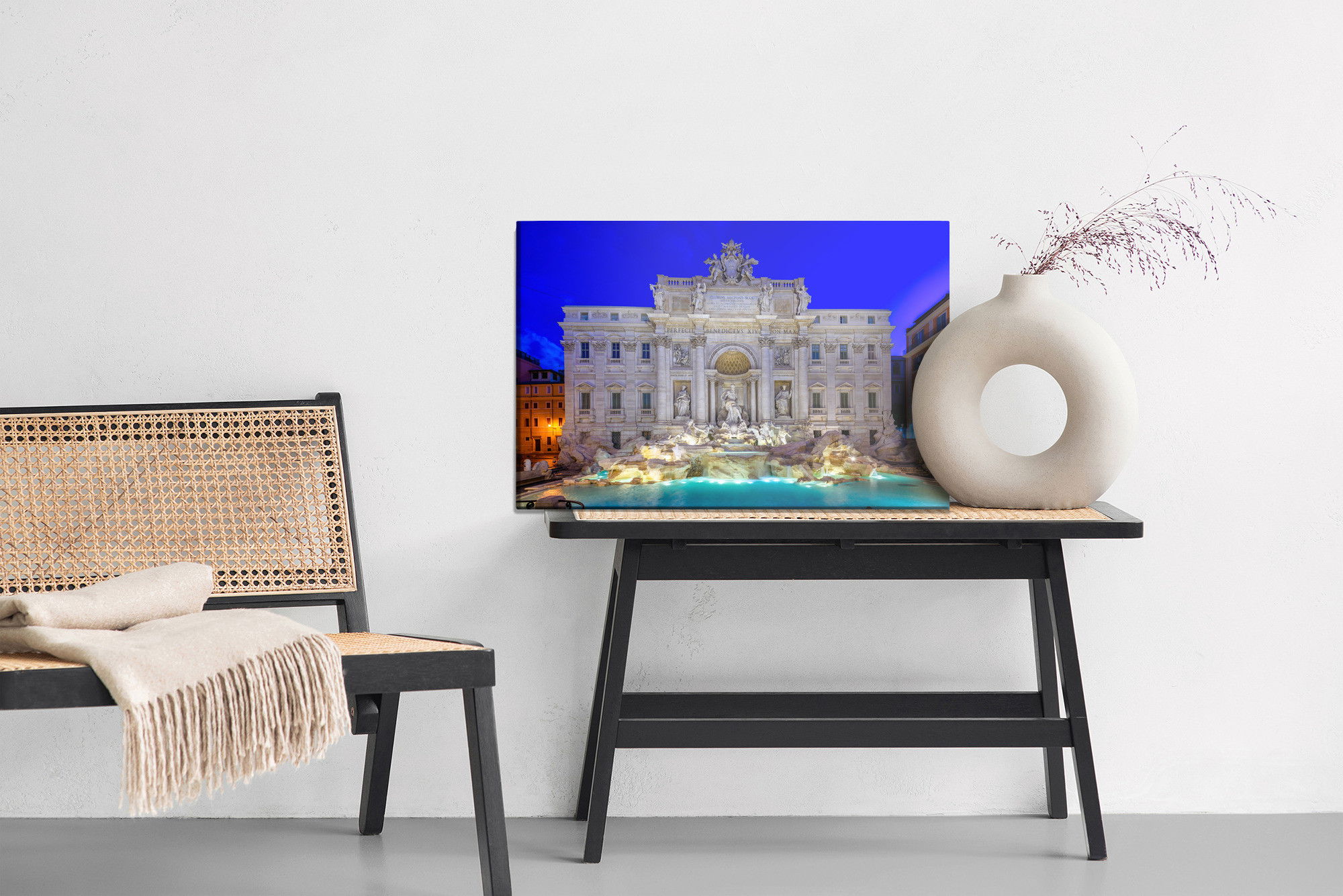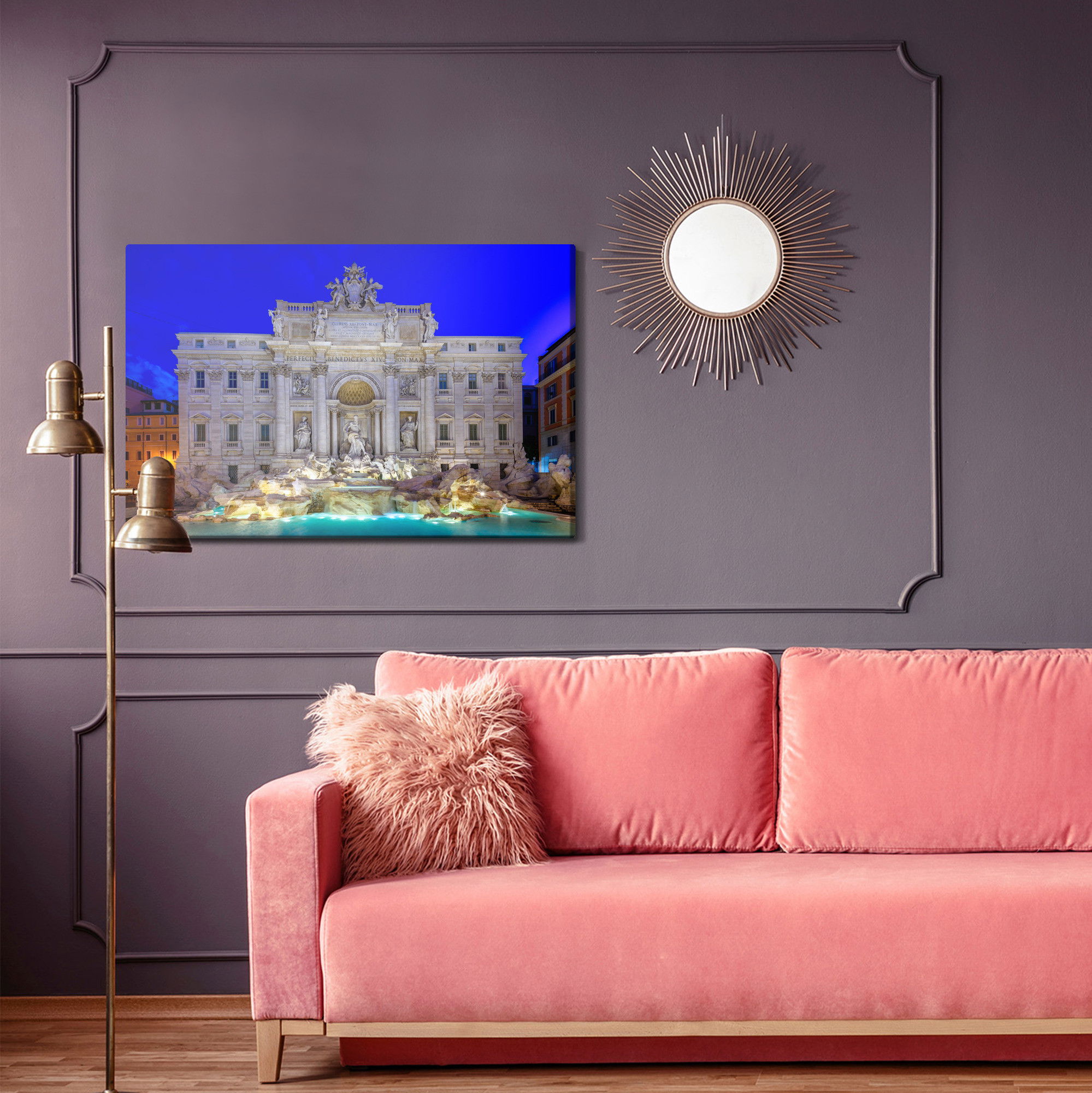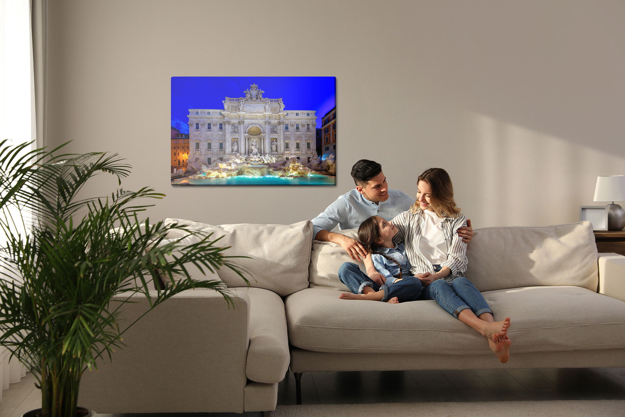 Motivet Trevi fountain in Rome återges med hög färgprecision och detaljrikedom tack vare HP Latex-teknologi. Trycket sker med vattenbaserade, luktfria och GREENGUARD Gold-certifierade bläck som ger en upplösning på upp till 300 DPI. Färgerna är UV-beständiga och behåller sin styrka även i ljusa rum, vilket gör tavlan lämplig för både hem- och offentliga miljöer.