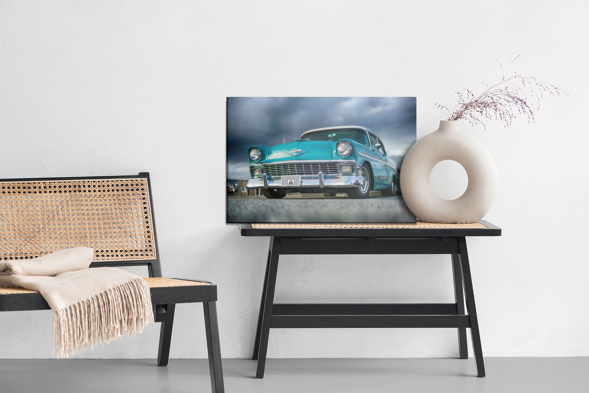 Motivet Turquoise car and clouds återges med hög färgprecision och detaljrikedom tack vare HP Latex-teknologi. Trycket sker med vattenbaserade, luktfria och GREENGUARD Gold-certifierade bläck som ger en upplösning på upp till 300 DPI. Färgerna är UV-beständiga och behåller sin styrka även i ljusa rum, vilket gör tavlan lämplig för både hem- och offentliga miljöer.