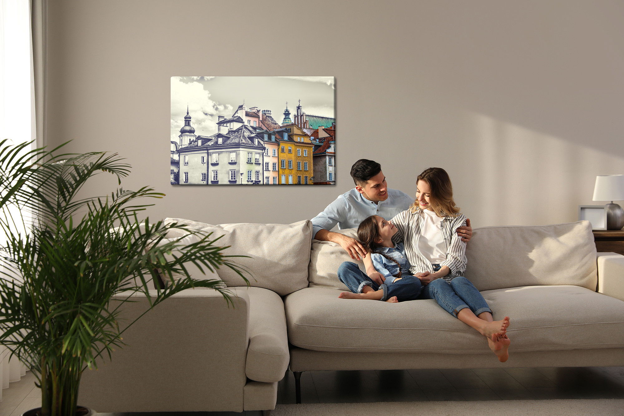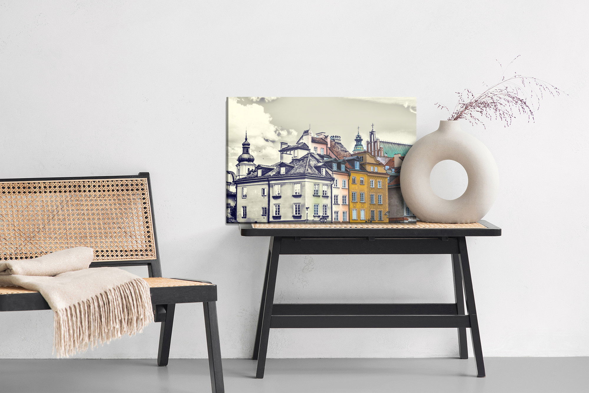 Varje tavla monteras på en massiv fururam. Format upp till 70×50 cm har en ram på 15 mm, medan format från 90×60 cm och uppåt har en ram på 20 mm. Den exakta dukspänningen gör att tavlan håller sin form över tid. Motivet Warsaw vintage buildings trycks runt hela ramen vilket ger ett stilrent galleriuttryck där tavlan är lika vacker från sidan som framifrån. Kombinationen av rak dukspänning, rena linjer och korrekt tryck ger en professionell finish.