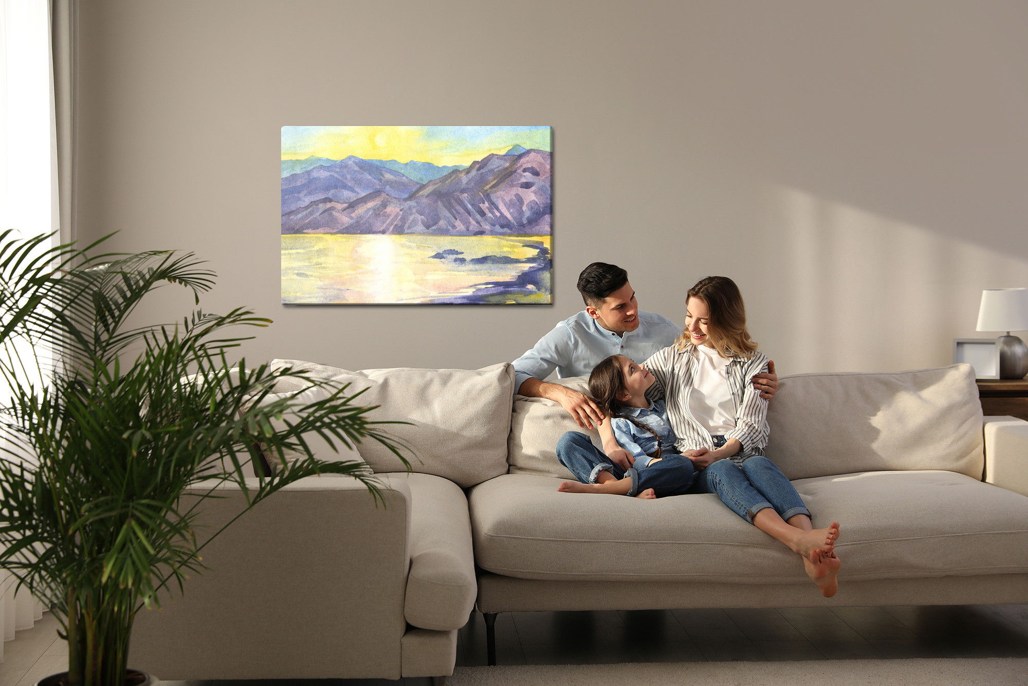 Motivet Watercolor mountain landscape återges med hög färgprecision och detaljrikedom tack vare HP Latex-teknologi. Trycket sker med vattenbaserade, luktfria och GREENGUARD Gold-certifierade bläck som ger en upplösning på upp till 300 DPI. Färgerna är UV-beständiga och behåller sin styrka även i ljusa rum, vilket gör tavlan lämplig för både hem- och offentliga miljöer.