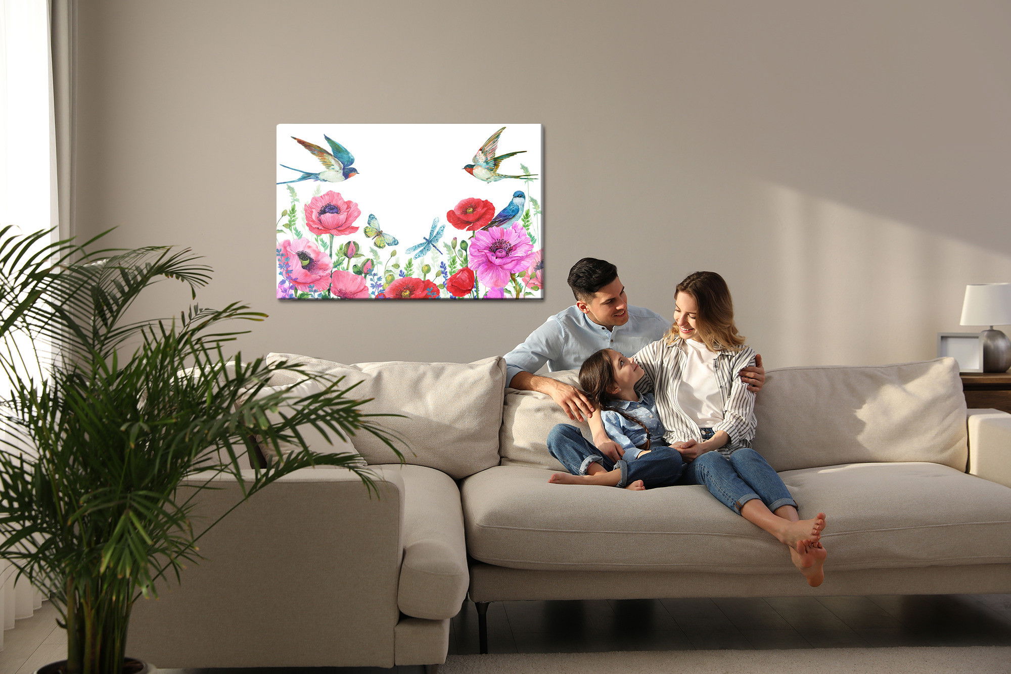 Varje tavla monteras på en massiv fururam. Format upp till 70×50 cm har en ram på 15 mm, medan format från 90×60 cm och uppåt har en ram på 20 mm. Den exakta dukspänningen gör att tavlan håller sin form över tid. Motivet Watercolor poppies trycks runt hela ramen vilket ger ett stilrent galleriuttryck där tavlan är lika vacker från sidan som framifrån. Kombinationen av rak dukspänning, rena linjer och korrekt tryck ger en professionell finish.