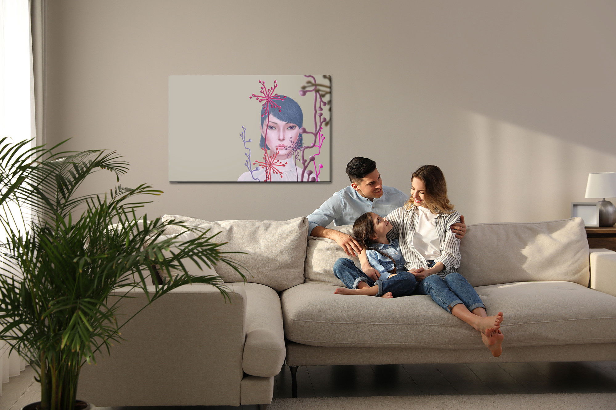 Motivet Woman and flower . concept återges med hög färgprecision och detaljrikedom tack vare HP Latex-teknologi. Trycket sker med vattenbaserade, luktfria och GREENGUARD Gold-certifierade bläck som ger en upplösning på upp till 300 DPI. Färgerna är UV-beständiga och behåller sin styrka även i ljusa rum, vilket gör tavlan lämplig för både hem- och offentliga miljöer.