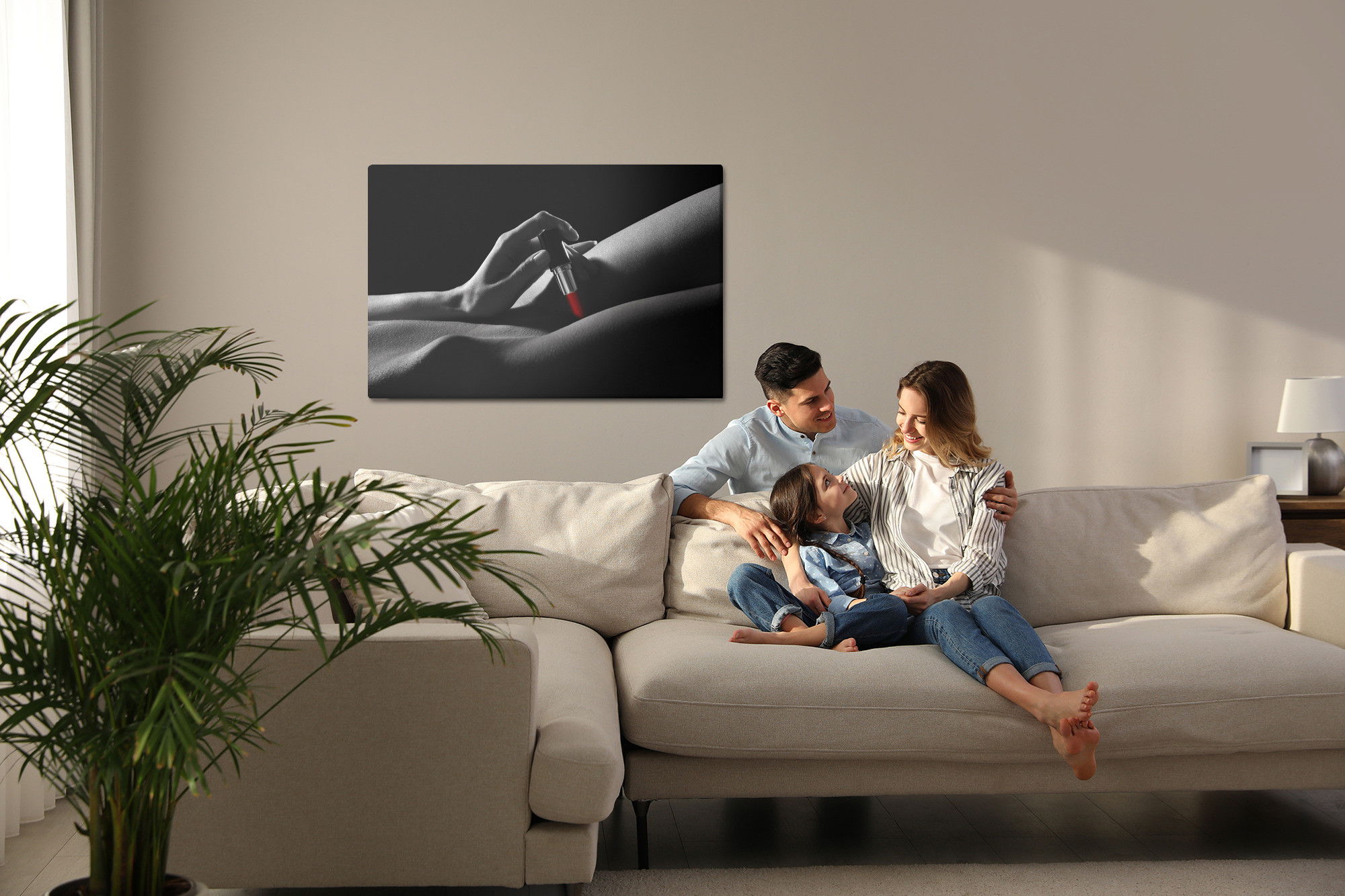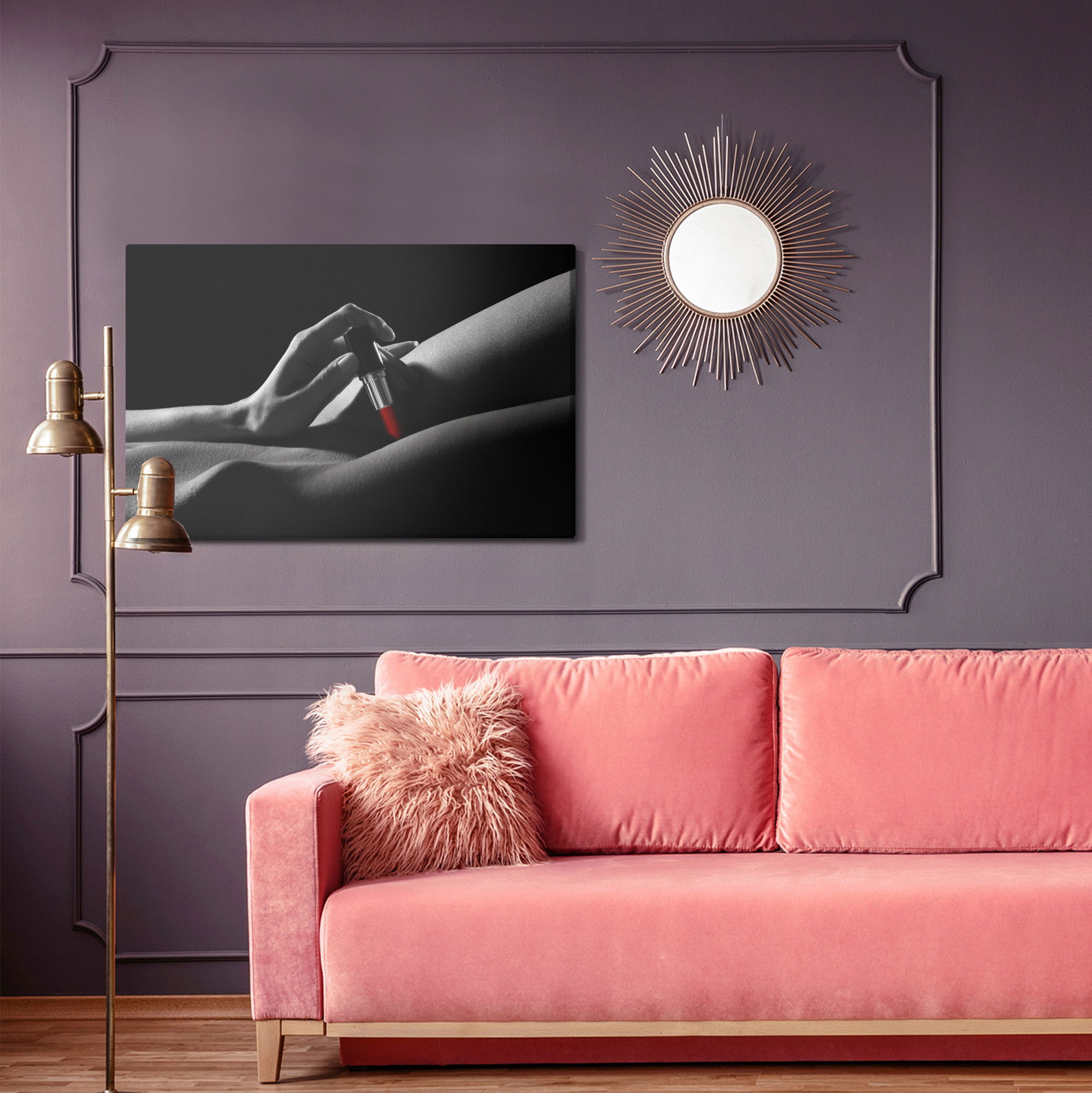 Varje tavla monteras på en massiv fururam. Format upp till 70×50 cm har en ram på 15 mm, medan format från 90×60 cm och uppåt har en ram på 20 mm. Den exakta dukspänningen gör att tavlan håller sin form över tid. Motivet Woman with lipstick trycks runt hela ramen vilket ger ett stilrent galleriuttryck där tavlan är lika vacker från sidan som framifrån. Kombinationen av rak dukspänning, rena linjer och korrekt tryck ger en professionell finish.